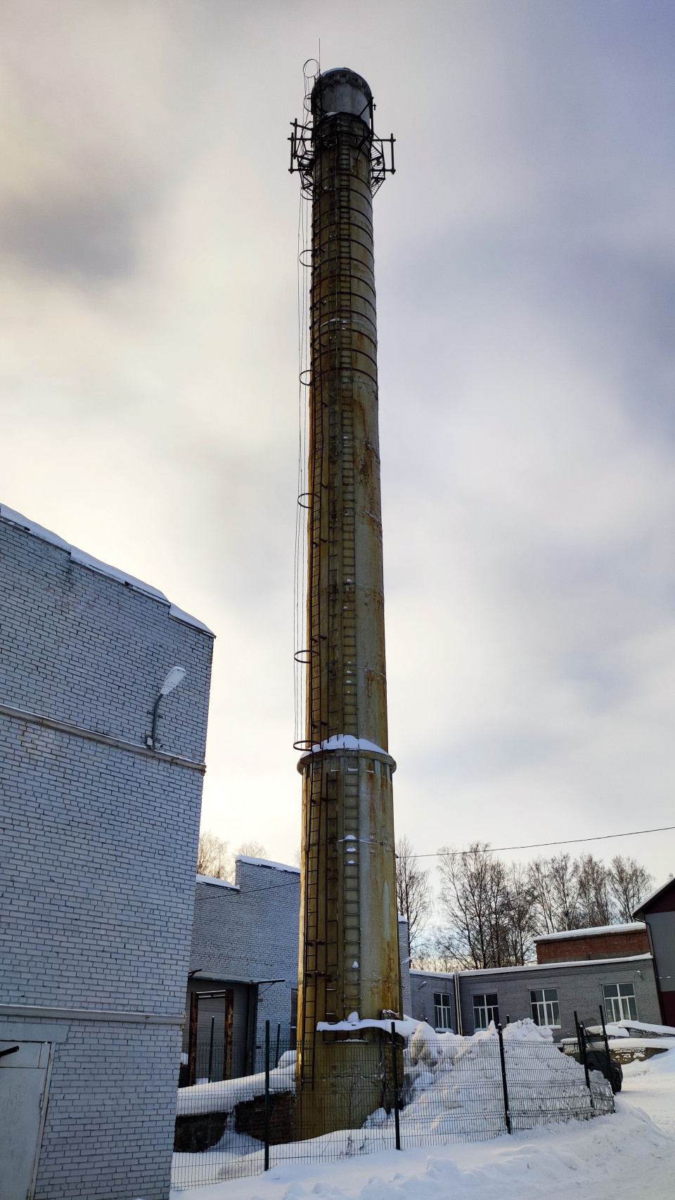 На снимке изображена высокая цилиндрическая промышленная дымовая труба с обмороженными и ржавеющими участками корпуса, расположенная на территории производственного комплекса зимой. В нижней части кадра видны кирпичные и блочные здания, частично укрытые снегом, а также металлическое ограждение. На трубе закреплены обслуживающие лестницы и элементы крепёжных конструкций. Объект не относится к культурному наследию и представляет собой стандартный элемент инфраструктуры теплотехнических или отопительных сооружений. Фотография подходит для публикаций о производственных зонах и инженерных объектах.