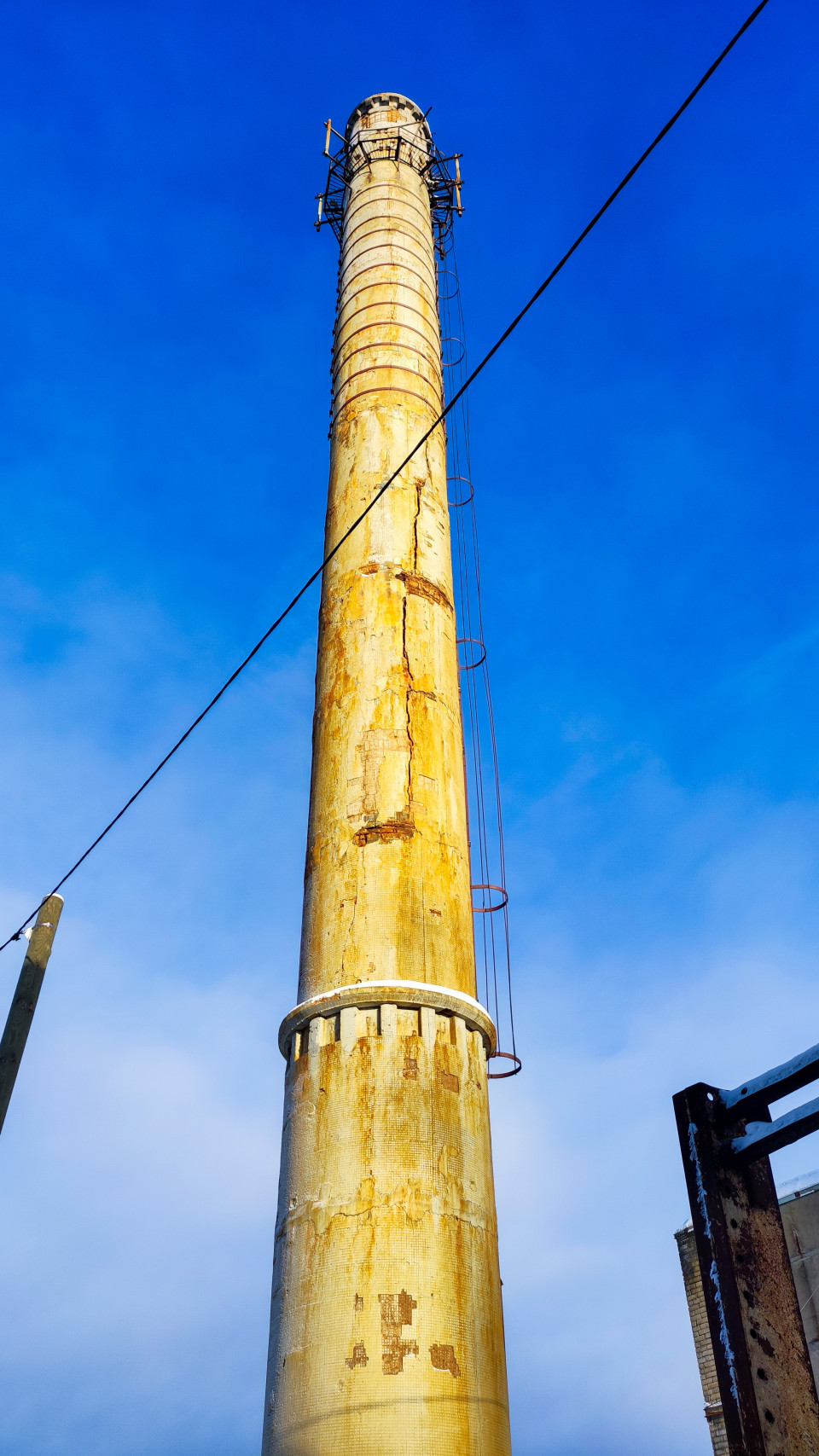 На изображении запечатлена высокая цилиндрическая промышленная дымовая труба с выраженными следами коррозии и трещинами на поверхности, снятая снизу крупным планом на фоне яркого синего неба. На верхнем участке конструкции видны металлические площадки, лестничные элементы и опорные крепления, используемые для технического обслуживания. Внизу заметен фрагмент каркаса другого сооружения и телекоммуникационный провод, проходящий через кадр. Объект не является памятником архитектуры, относится к промышленной инфраструктуре заводских территорий и служит для отвода продуктов горения. Фотография может применяться в материалах о промышленной среде, инженерных сооружениях и технической эксплуатации.