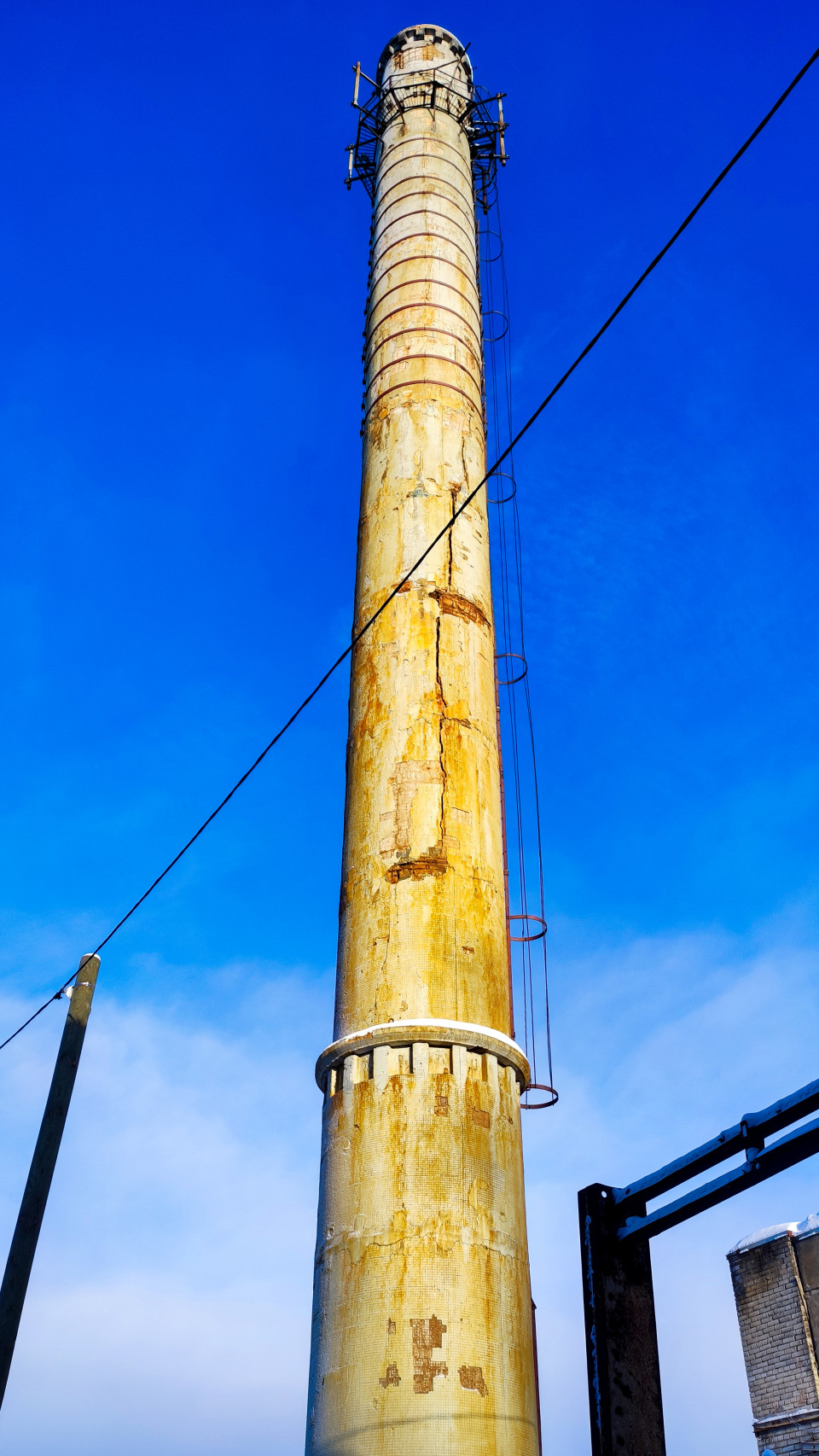 На снимке показана высокая цилиндрическая дымовая труба из монолитного бетона с металлическим ограждением на вершине и обслуживающей лестницей вдоль корпуса. Поверхность трубы имеет следы коррозии, растрескивания и обсыпавшееся защитное покрытие, что указывает на длительный срок эксплуатации и отсутствие недавнего ремонта. Судя по стилю и материалам, объект относится к типовым промышленным сооружениям второй половины XX века, использовавшимся на теплоэнергетических и производственных предприятиях. Фотографию можно использовать для статей о технике безопасности, промышленной архитектуре или исследованиях городской среды.