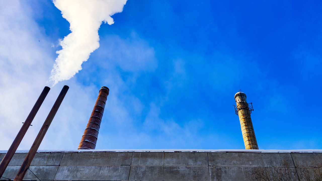 Дымовая труба котельной выбрасывает дым в чистое небо