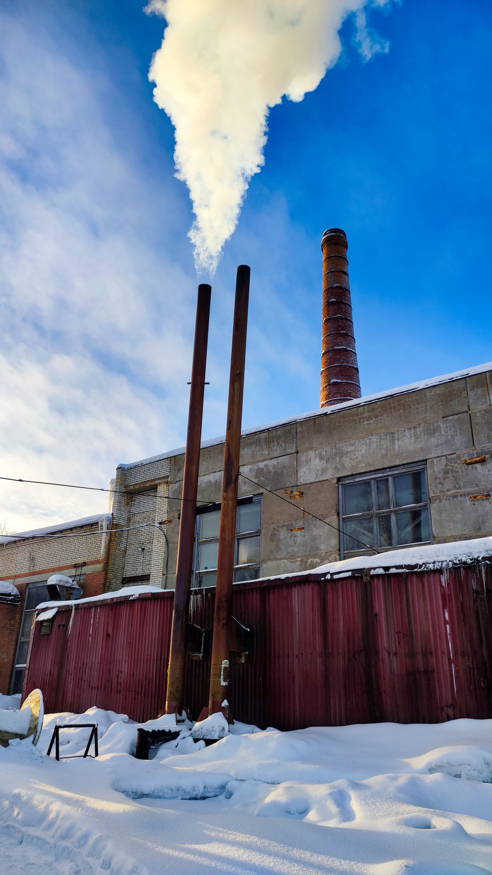 На фотографии показаны два высоких металлических дымохода, из которых поднимается плотный пар, и стоящая позади них кирпичная дымовая труба промышленного предприятия. На заднем плане виден фасад производственного здания с окнами и следами эксплуатации, а внизу — снежный покров и временные металлические конструкции. Снимок отражает рабочий режим инженерных установок, характерных для теплоэнергетики в холодных регионах. Материал можно использовать в публикациях о промышленной инфраструктуре и энергетике.