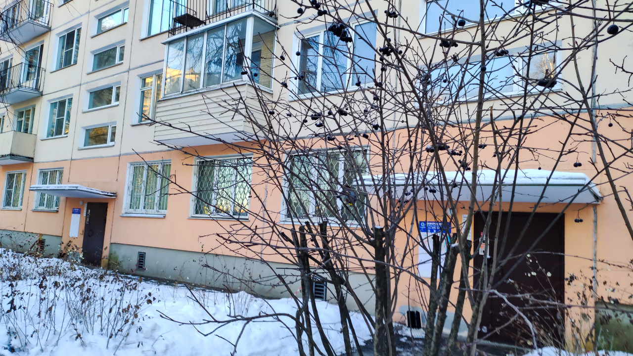 На снимке показан фасад типового многоквартирного дома советской застройки, относящегося к массовым сериям жилфонда второй половины XX века. Видно несколько этажей с балконами, застеклёнными лоджиями и металлическими решётками на окнах нижнего уровня. У входов установлены навесы, рядом расположен кодовый домофон. Перед домом — заснеженная придомовая территория и кустарники, находящиеся в зимнем состоянии. Подобные здания широко распространены в городах бывшего СССР и используются как пример стандартной городской архитектуры. Изображение подходит для иллюстрации тем о жилищном фонде и городской среде.