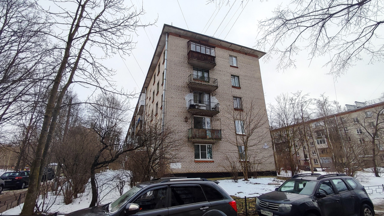 Фотография демонстрирует пятиэтажный кирпичный дом с балконами на боковом фасаде, окружённый деревьями и автомобильной парковкой. Архитектура дома указывает на типовую серию, распространённую в советский период, с рациональными пропорциями и минимальным декором. Улица покрыта снегом, климатические условия соответствуют зиме. В кадре отсутствуют объекты культурного наследия, присутствует повседневная городская среда. Изображение полезно для публикаций об урбанистике и типовой жилой архитектуре.