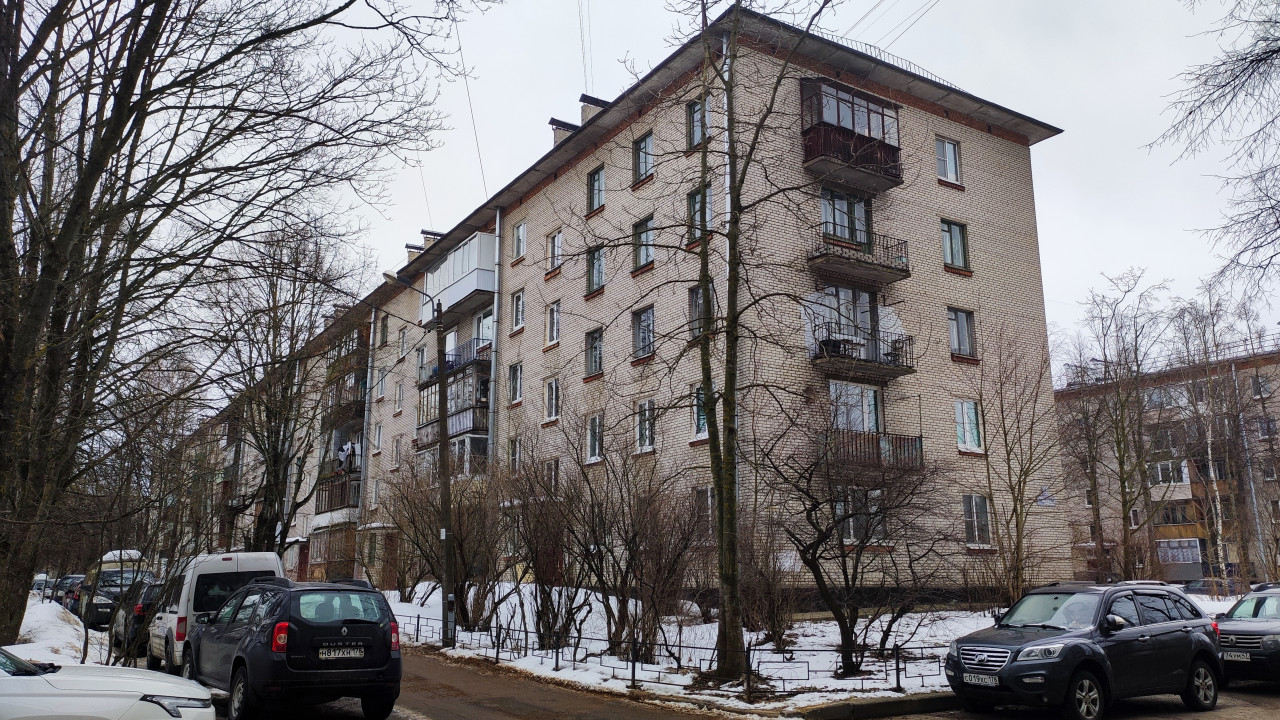 На фото изображён пятиэтажный кирпичный жилой дом, типичный для массового строительства второй половины XX века на территории бывшего СССР. По фасаду видно несколько балконов разного состояния, что визуально отражает длительный период эксплуатации здания. Перед домом расположен ряд припаркованных машин, обочина и тротуар с остатками снега, а рядом — голые деревья. Такой тип застройки нередко относят к развивающей жилой инфраструктуре 1960–1980-х годов. Изображение может использоваться для иллюстраций городской среды и бытовых сцен.