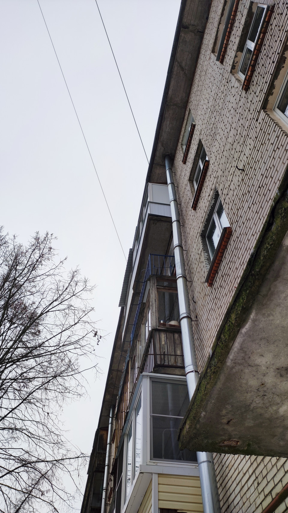 Фотография фиксирует торцевую часть пятиэтажного жилого дома из кирпича с несколькими балконами, частично остекленными. Съёмка ведётся снизу вверх, акцентируя высоту здания и конструктивные элементы кровли. По краю кадра видны ветви деревьев, характерные для дворовых территорий. Зимний сезон обозначен снежным покровом и отсутствием листвы. Изображение подходит для публикаций о жилом фонде, урбанизации и архитектурных типах городских кварталов.