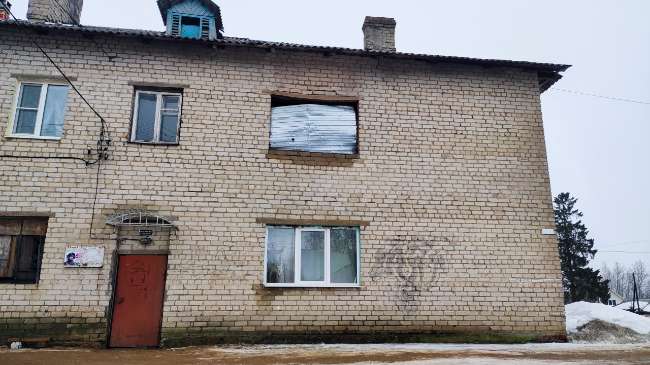 На фото показана ближняя перспектива кирпичного фасада, где верхний оконный проём временно закрыт металлическим или листовым материалом. Виден вход в подъезд и элементы проводки, фиксирующие износ и необходимость ремонта. Стиль здания соответствует массовым жилым домам середины XX века, распространённым в небольших населённых пунктах. Изображение подходит для публикаций о состоянии жилфонда, реконструкции и инженерном обслуживании домов.