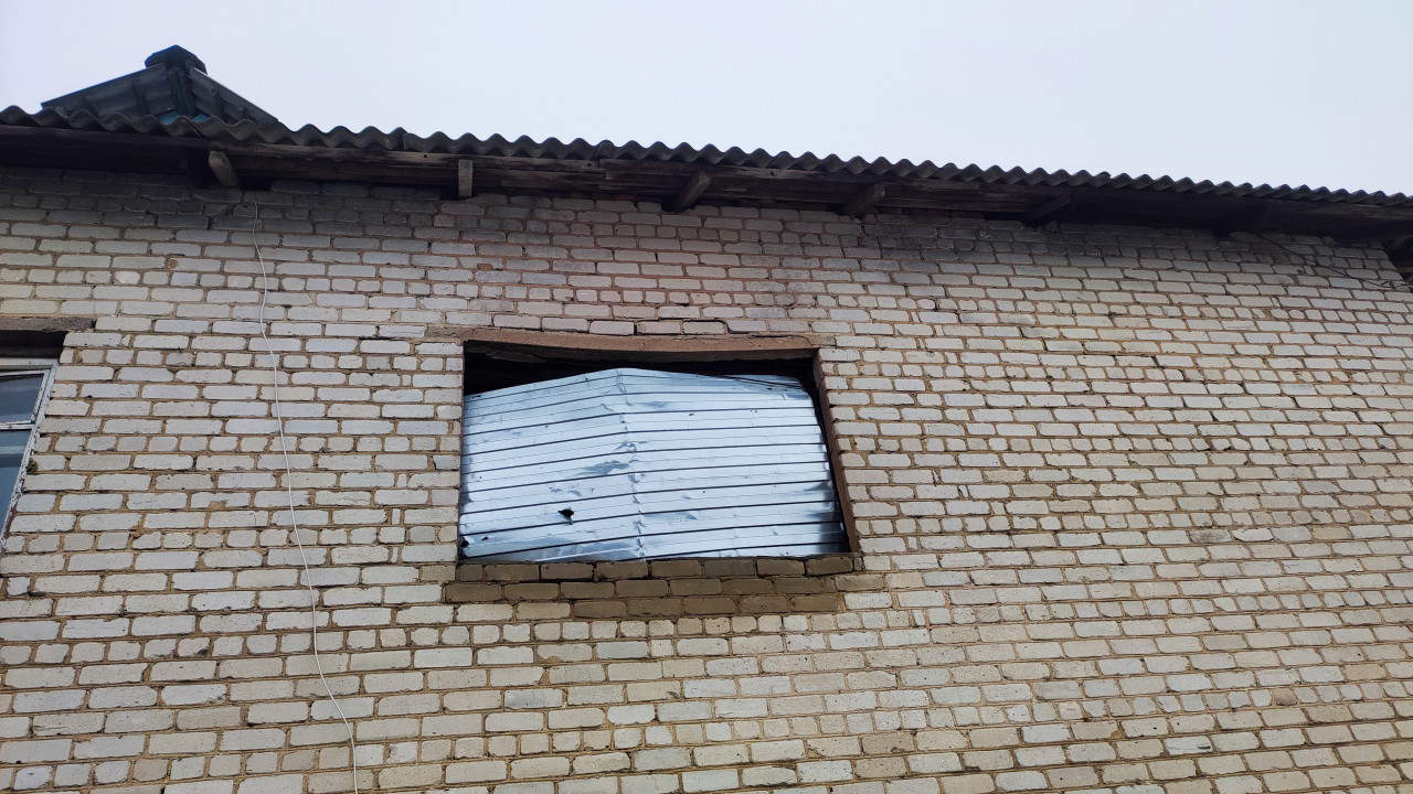 На изображении представлен крупный план верхней части фасада кирпичного дома, где оконный проём заглушён листовым покрытием, предположительно в связи с ремонтом или отсутствием жилого помещения. Кровля покрыта шифером, характерным для малоэтажных жилых зданий второй половины XX века. Видны следы износа и временных мер защиты от осадков. Кадр можно использовать в материалах о состоянии жилья, реконструкции и локальных особенностях городской застройки.