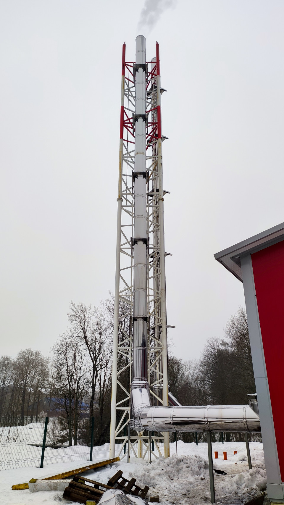 Фото демонстрирует вертикальную металлическую дымовую трубу с опорной фермой, установленную на территории котельной. Конструкция выведена выше уровня зданий для рассеивания продуктов сгорания, к основанию подведены теплоизолированные трубопроводы. Вокруг лежит снег, что указывает на зимний сезон. Снимок может быть использован в архитектурно-инженерных публикациях, энергетических обзорах и отчётах по коммунальной инфраструктуре.