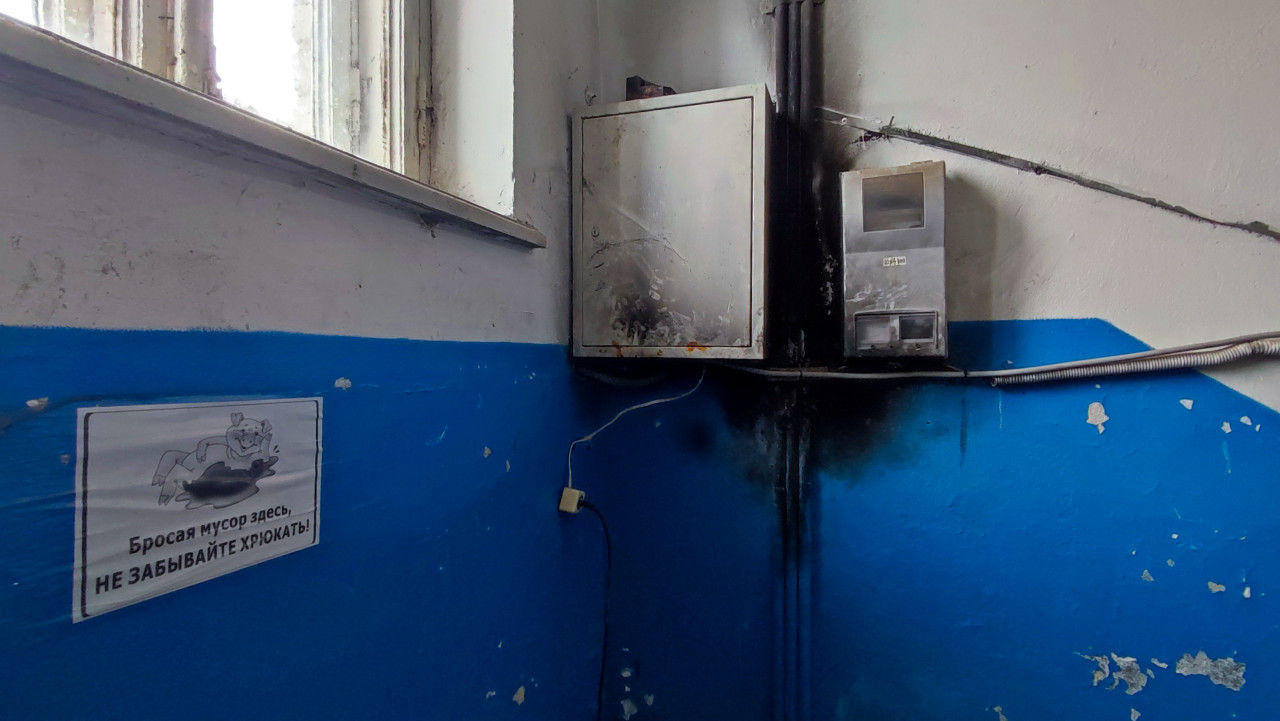 На фото показан угол подъезда старого многоквартирного дома, где размещён электротехнический шкаф и распределительный блок с видимыми следами копоти. На стене закреплена табличка с шутливым предупреждением о выбрасывании мусора. Окраска стен и состояние штукатурки типичны для зданий середины–конца XX века. Изображение отражает сочетание устаревших инженерных решений и бытовых инициатив жильцов. Материал может быть использован в публикациях о городской инфраструктуре, состоянии общедомового имущества и визуальной фиксации среды постсоветских подъездов.
