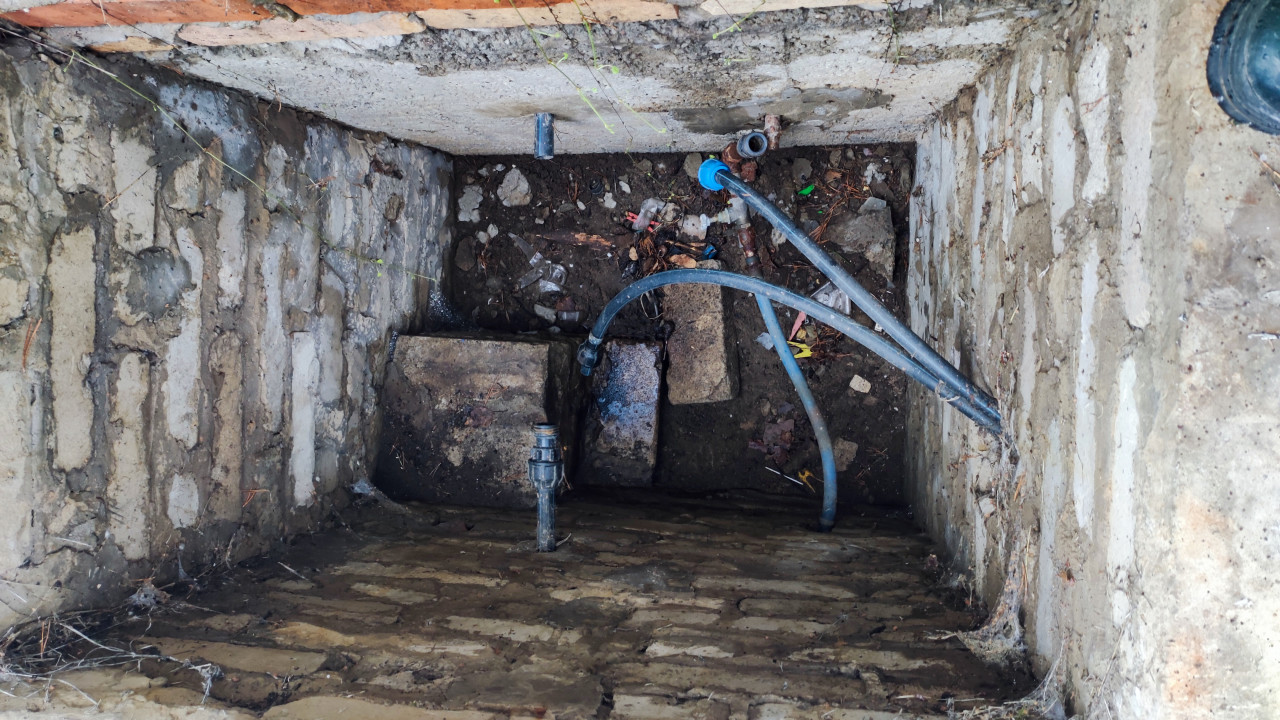 На фото показан инженерный колодец с кирпичными стенками и бетонным перекрытием, внутри которого размещены трубопроводы и соединительные элементы системы водоснабжения. На дне и стенах видны следы влаги, грязи и мусора, что свидетельствует о длительной эксплуатации без капитальной очистки. Такие ревизионные колодцы используются для доступа к подземным инженерным сетям и относятся к инфраструктуре жилищно-коммунального хозяйства. Изображение может применяться в технической документации, учебных материалах и публикациях о состоянии коммунальных систем.
