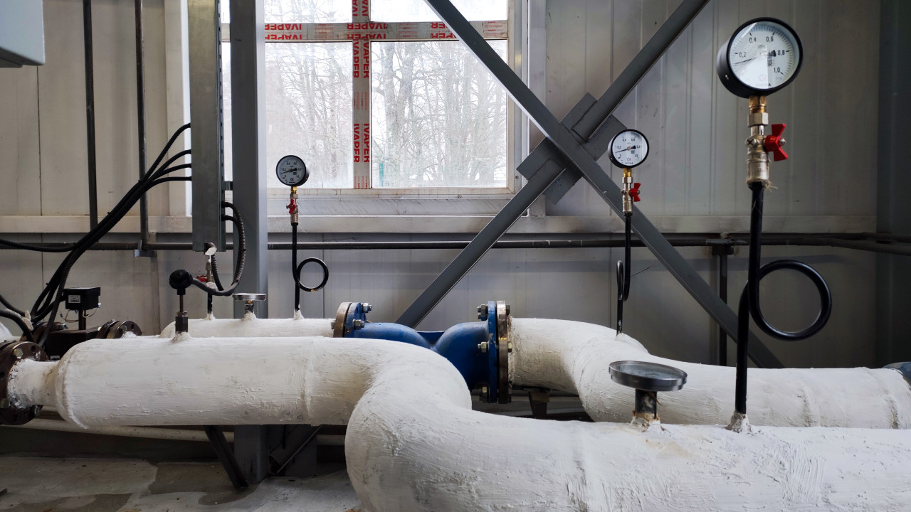 Фотография отображает часть теплотехнической системы с утеплёнными трубопроводами, на которых установлены несколько манометров для контроля давления. В кадре видны металлические стойки, оконный проём и опорные элементы, закрепляющие систему на основании. Голубые соединительные секции указывают на переходные узлы между сегментами трубопровода. Эта сцена характерна для тепловых пунктов, обеспечивающих подачу теплоносителя. Снимок подходит для инженерных публикаций, обучающих материалов и отраслевых презентаций.