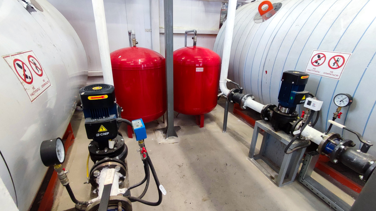 Фото демонстрирует два красных расширительных бака, подключённых к трубопроводу с насосным оборудованием и элементами автоматики. Слева и справа видны крупные промышленные резервуары, относящиеся к системе теплоснабжения или водоподготовки. На трубах размещены манометры и запорная арматура, а монтаж выполнен на металлических рамах для устойчивости. Помещение имеет техническое назначение и используется как часть инженерного комплекса. Фотография подходит для иллюстрации в учебных или проектных материалах.