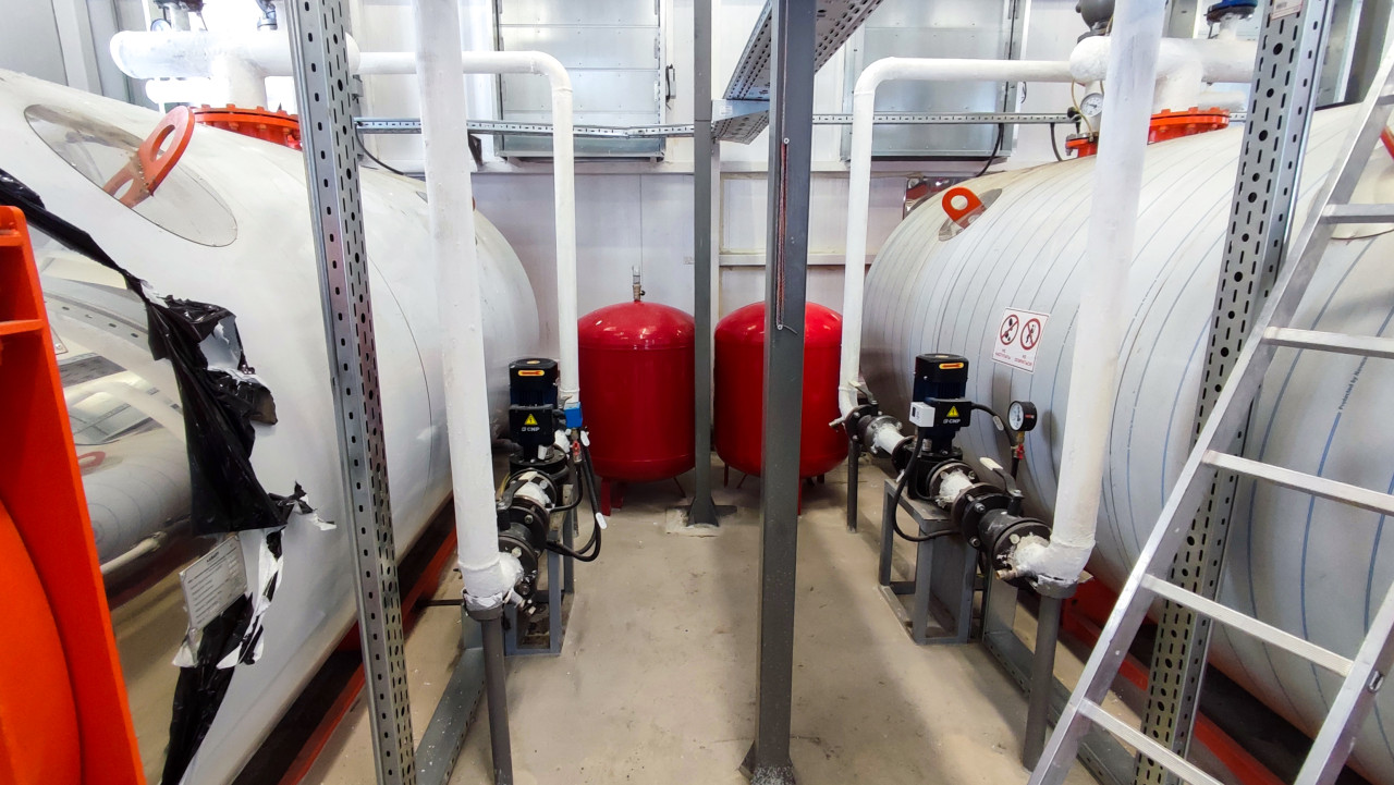 На изображении показана зона насосного оборудования с двумя красными расширительными баками, расположенными между крупными промышленными резервуарами. Трубопровод покрыт теплоизоляцией, на нём установлены манометры и соединительная арматура. Опорные рамы и металлические стойки удерживают инженерные линии на нужной высоте. Данный объект относится к системам отопления и регулирования давления в тепловых комплексах. Фотография может быть использована для учебных материалов и инженерных каталогов.