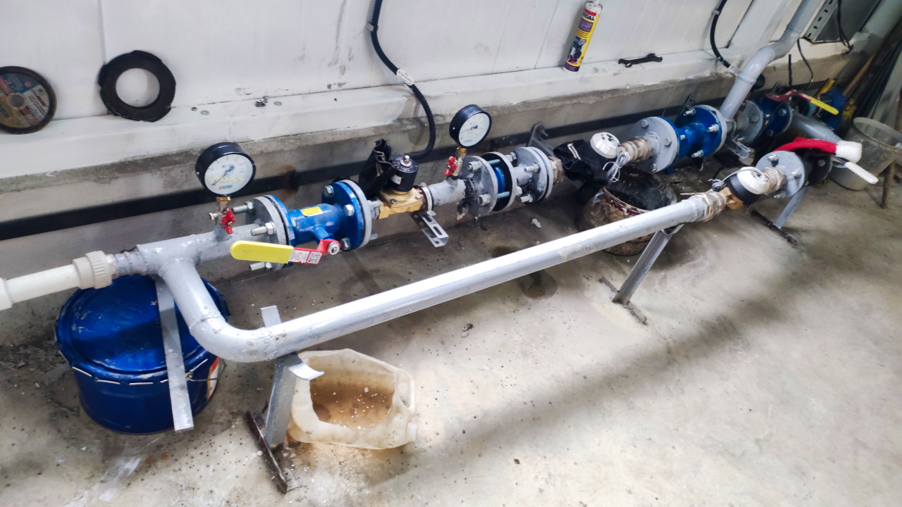 На фотографии показан линейный участок инженерного трубопровода, оборудованный несколькими манометрами, запорной арматурой и соединительными элементами. Трубы закреплены на металлических стойках и проходят вдоль стены технического помещения. На полу заметны ёмкости и сервисные материалы, что указывает на эксплуатационную зону или участок обслуживания. Такой тип узлов используется в котельных и насосных станциях для контроля давления и расхода теплоносителя. Изображение подходит для учебных пособий, инструкций по эксплуатации и технических иллюстраций.