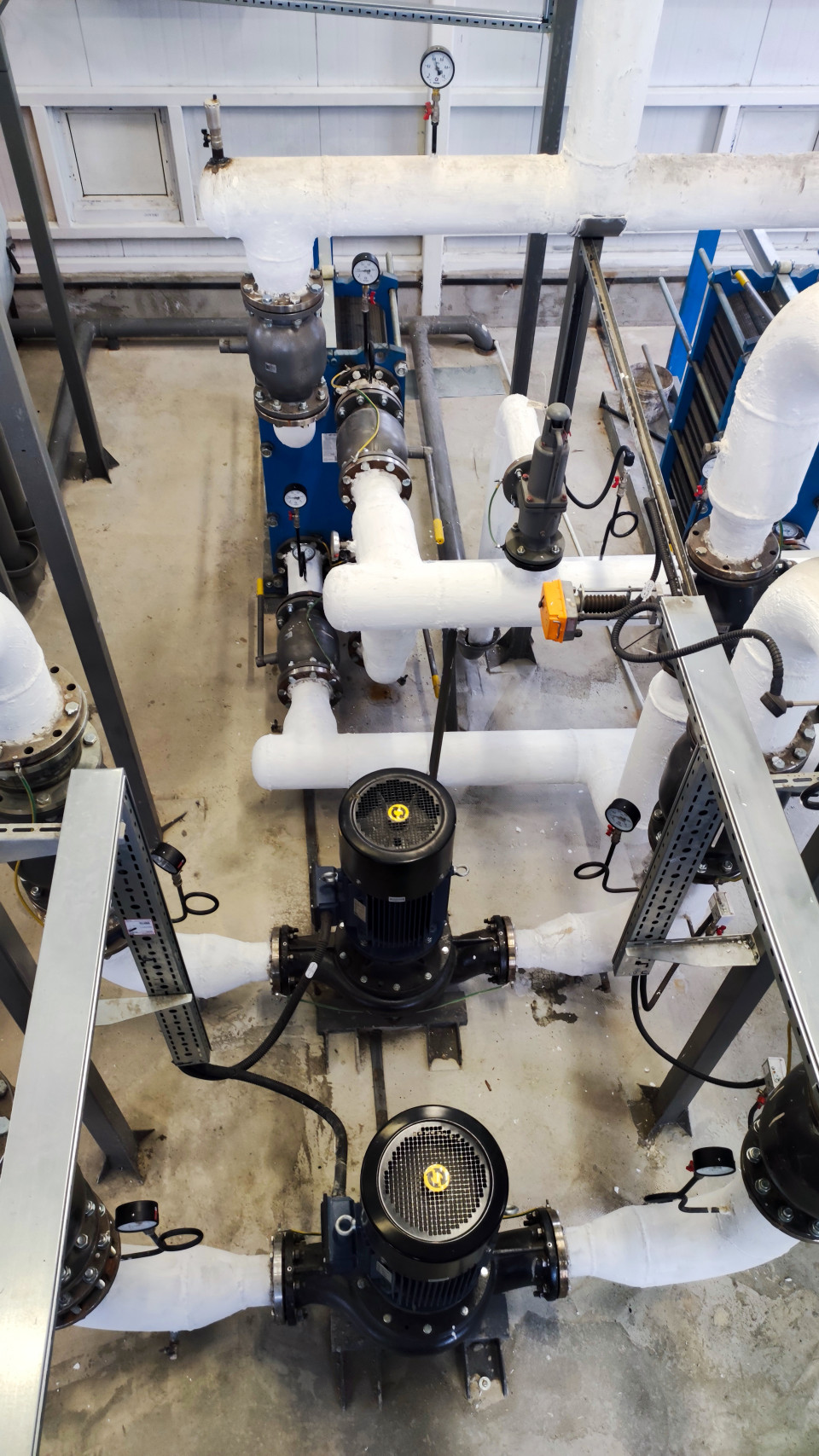 На фото запечатлён насосный узел внутри технического помещения, где установлено несколько циркуляционных насосов, подключённых к изолированным трубопроводам. Видны фланцевые соединения, манометры и поддерживающие металлоконструкции, формирующие вертикальную и горизонтальную разводку системы. Оборудование относится к теплотехнической инфраструктуре, обеспечивающей циркуляцию теплоносителя в контуре. Сцена характерна для тепловых пунктов, котельных и промышленных объектов коммунальной энергетики. Изображение подходит для технических инструкций, учебных пособий и отраслевых презентаций.