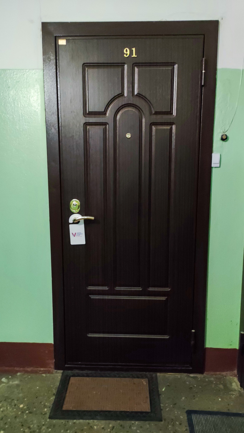 На фото показана металлическая входная дверь с номером 91, установленная в подъезде многоквартирного дома. Стены окрашены типичным для подъездов двухцветным способом, виден выключатель и участок напольного покрытия. Дверь современного типа, что характерно для обновленной фурнитуры в домах советской и постсоветской застройки. Изображение подходит для тем, связанных с жильем, безопасностью и эксплуатацией подъездных помещений.