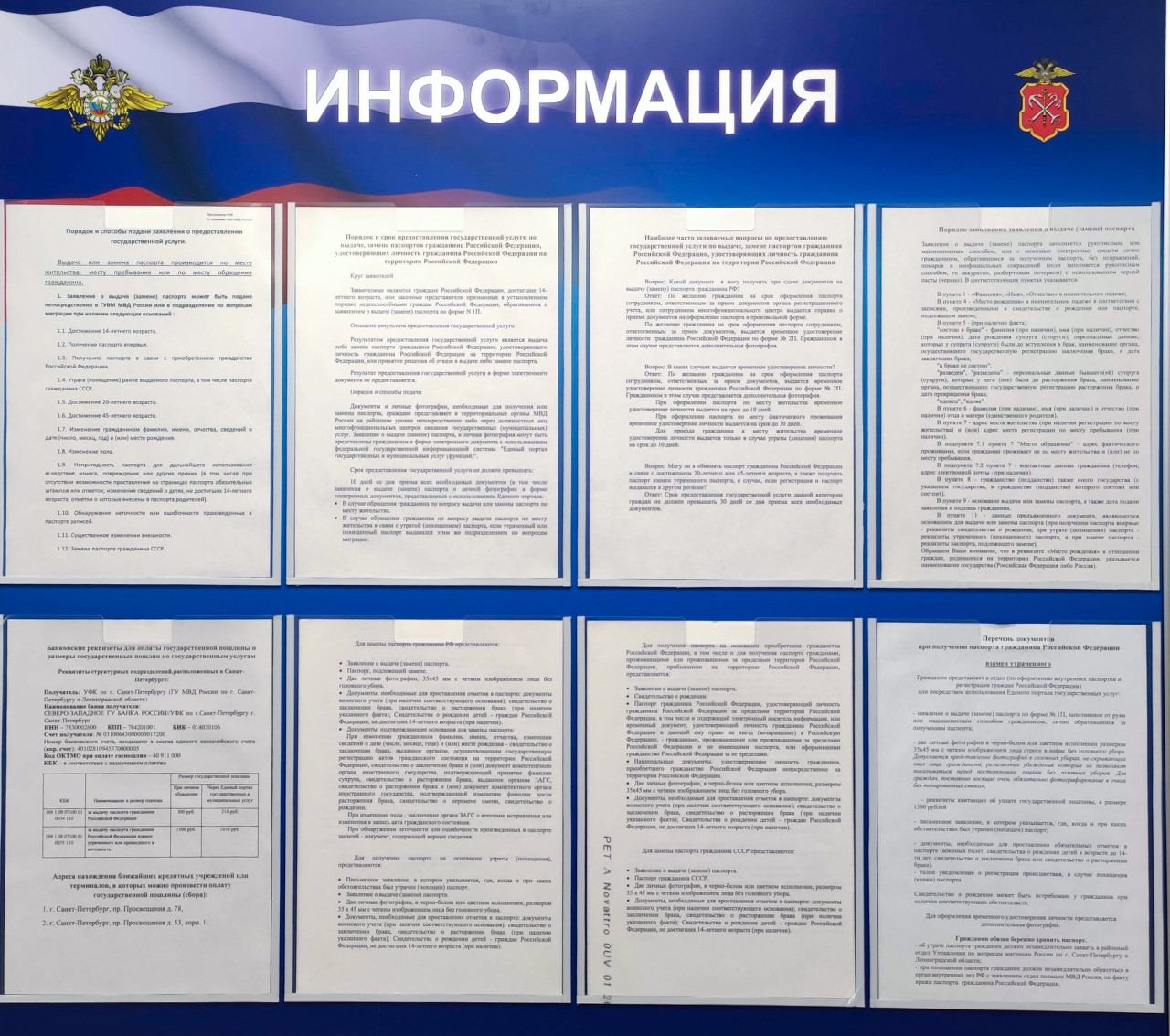 На фото размещен информационный стенд ведомственного учреждения, где расположены распечатанные листы с правилами приема, условиями предоставления услуг и перечнями необходимых документов. В верхней части присутствуют символика и название раздела «Информация», характерные для стендов подразделений МВД России. Бумажные материалы аккуратно разложены по секциям, что отражает стандарт публичного информирования граждан. Снимок полезен для иллюстраций о регламенте обслуживания населения и работе государственных органов.
