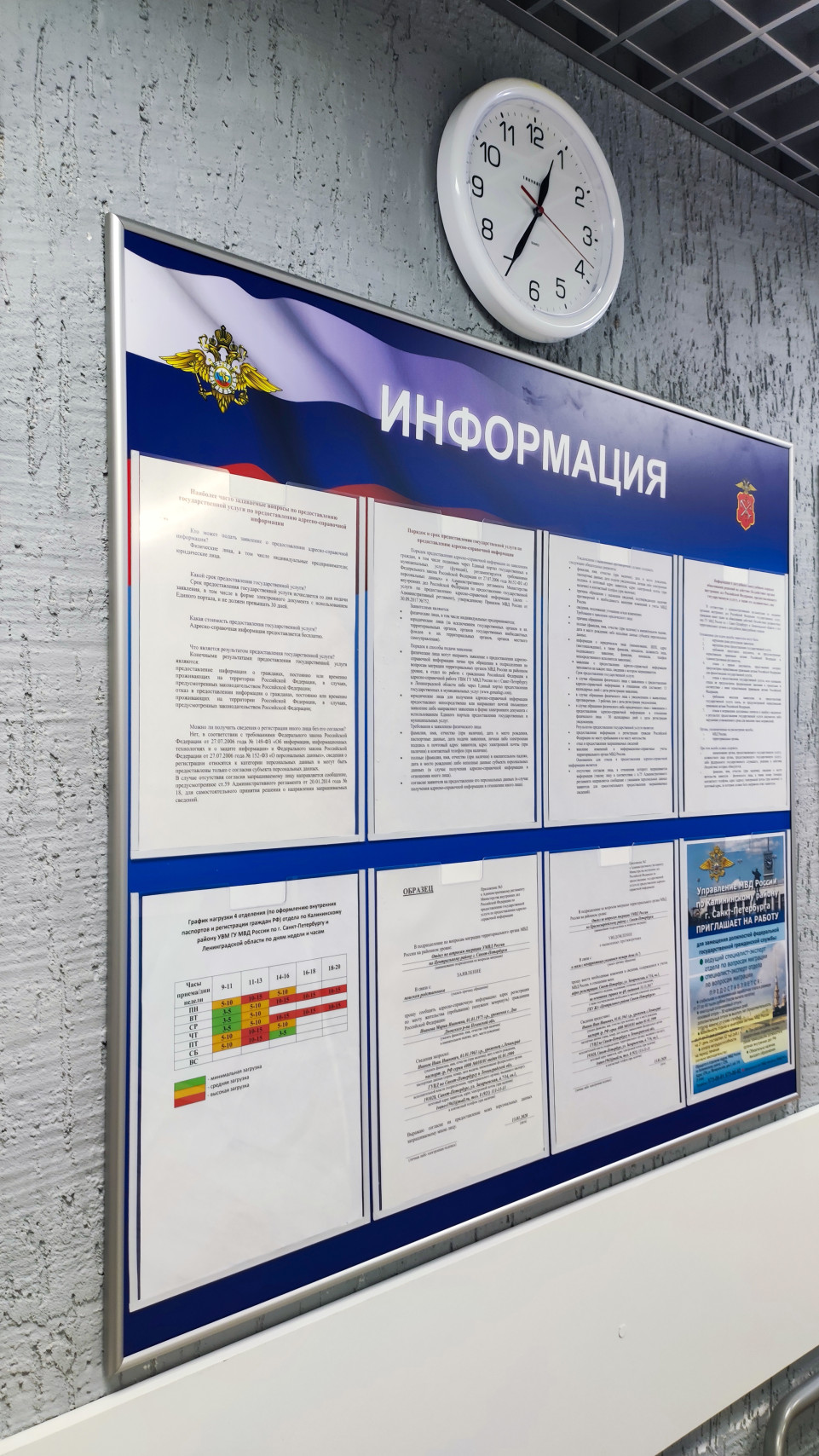 Снимок отражает стену помещения госучреждения, где установлен информационный стенд МВД со сводом правовых материалов, а над ним размещены настенные часы с маркировкой минутной и часовой шкалы. На стенде видны тексты регламентов, график нагрузки и объявление о наборе персонала. Фон выполнен в официальных цветах с символикой ведомства. Фотография полезна для демонстрации процедуры открытого информирования граждан и стандартов оформления в административных учреждениях.