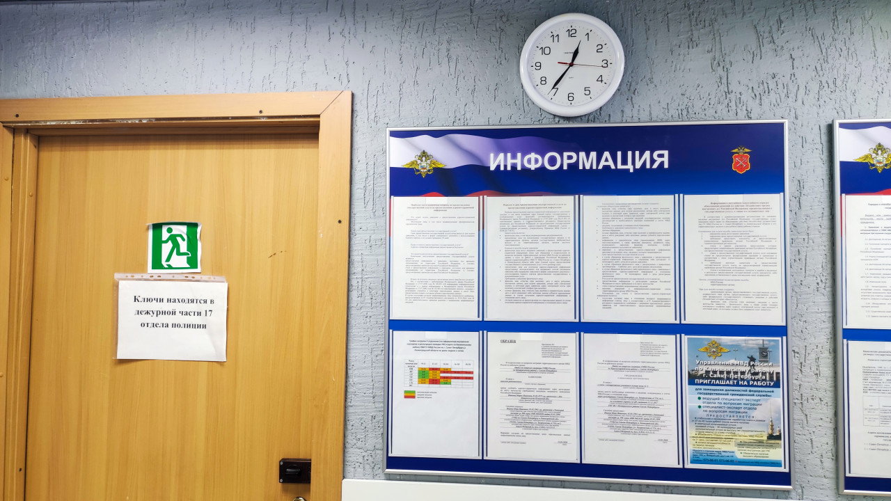 На фотографии изображена стена административного здания с дверью и расположенным рядом информационным стендом МВД России, содержащим обязательные к публикации документы и графики. Над стендом размещён настенный часовой механизм, а на двери имеется табличка с указанием о месте хранения ключей, что дополнительно подчёркивает служебный характер пространства. Обстановка и символика указывают на зону для посетителей в отделе полиции или ином государственном учреждении. Изображение может применяться для материалов о внутреннем устройстве ведомств и навигации для граждан.