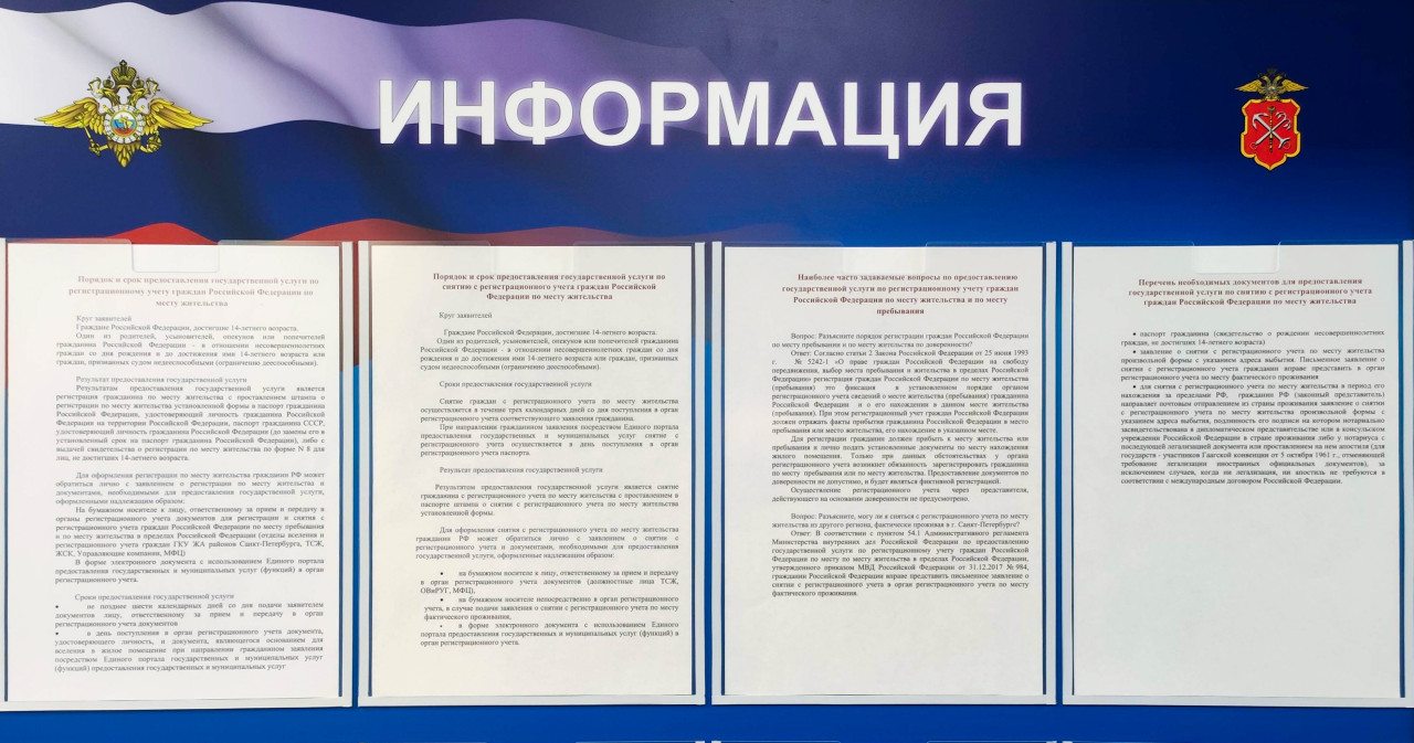 На фото изображен фрагмент информационного стенда МВД с крупными текстовыми листами, посвященными порядку регистрации и снятия граждан с регистрационного учета по месту жительства. В оформлении присутствует государственная символика, включая герб МВД и региональный знак. Стенд расположен на внутренней стене ведомственного помещения и служит источником обязательной информации для посетителей. Документы размещены вертикально и доступны для ознакомления. Фотография подходит для сопровождения материалов о правовом регулировании и административных процедурах.