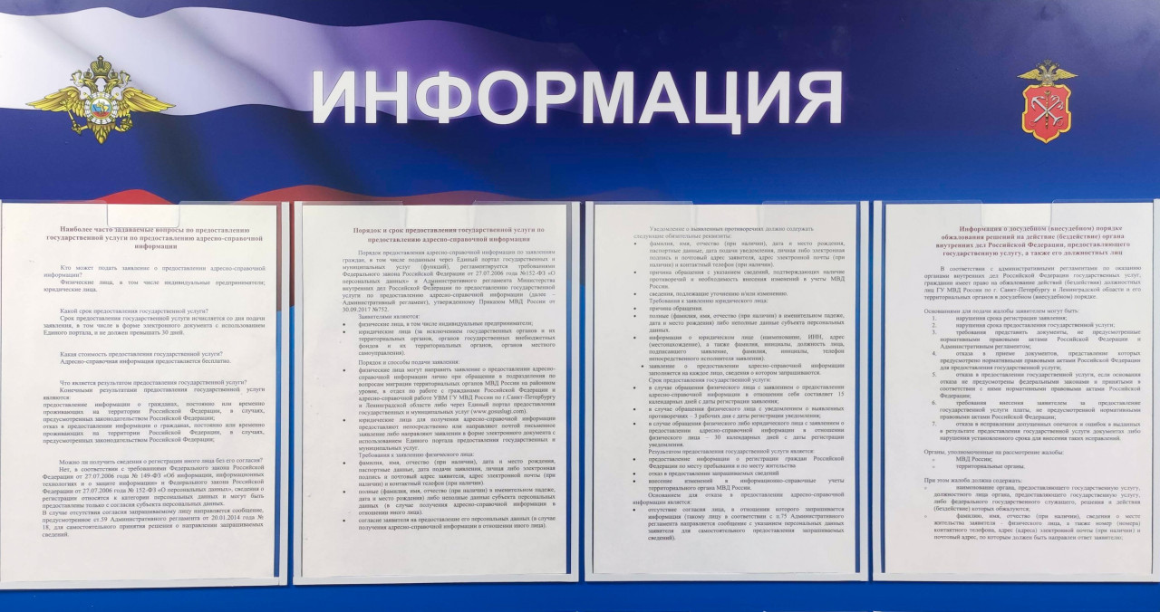 На фото показан верхний фрагмент информационного стенда в помещении территориального подразделения МВД России, оформленного в официальных цветах и дополненного изображением государственного флага и гербовой символикой. Видны листы с текстами о правилах предоставления адресно-справочной информации, сроках рассмотрения заявлений и порядке обращения. Такой тип стендов устанавливается в приемных зонах структур, занимающихся миграционным учетом и предоставлением государственных услуг населению. Изображение может использоваться в материалах о работе ведомств и разъяснении административных процедур.
