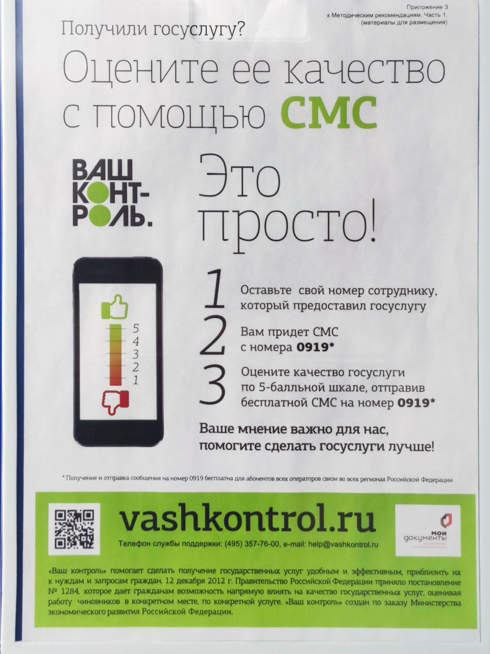 Снимок представляет собой крупный план стендовой печатной листовки, содержащей поэтапную инструкцию для граждан по отправке SMS-оценки полученной услуги. В нижней части размещен интернет-адрес платформы обратной связи и контактные данные. Формат плаката соответствует методическим материалам ведомств, применяемым для информирования посетителей в зонах ожидания и приема. Кадр может быть использован в публикациях о государственных сервисах и инструментах контроля исполнения госфункций.