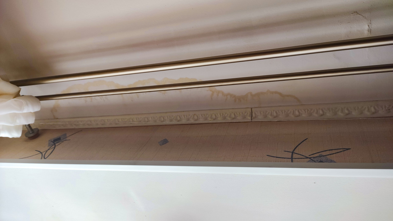 На фото запечатлена верхняя часть стены жилой комнаты, где под потолком и металлическим карнизом для штор видны вытянутые буроватые подтеки влаги. На обоях просматривается рисунок, а в левой части — часть светлой занавеси. Такие следы указывают на длительное попадание воды через верхние конструкции здания, что характерно для жильцов верхних этажей при протечке кровли. Изображение может быть использовано в статьях о последствиях нарушений гидроизоляции и необходимости обследования здания.