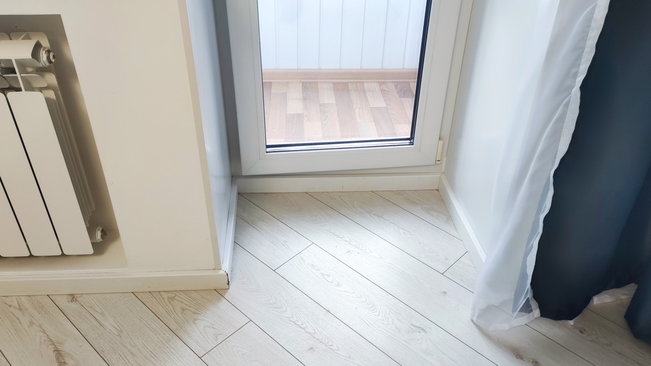 На снимке интерьер квартиры: участок пола с ламинатом у балконной двери ПВХ-профиля, частично видна батарея отопления и стеновой плинтус. За дверью наблюдается застеклённый балкон с деревянным напольным покрытием. Такое изображение подходит для материалов о ремонте, утеплении, монтаже напольных и оконных конструкций, а также для статей о бытовых интерьерах и энергоэффективности жилья.