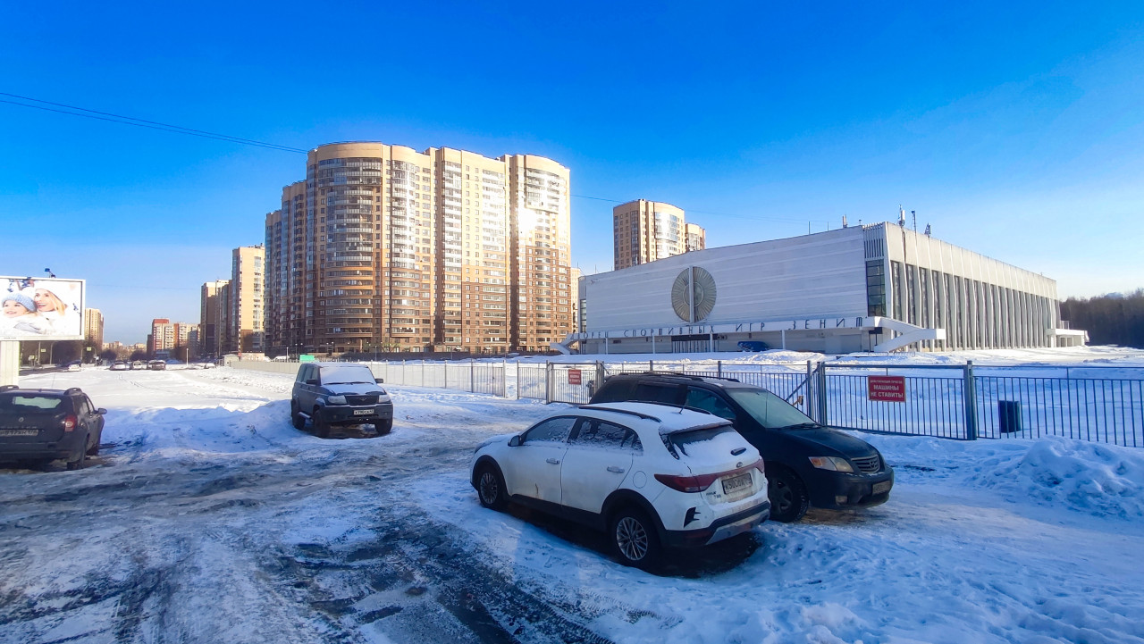 На изображении зафиксирована городская улица зимой, на переднем плане расположена парковка с автомобилями, а на заднем плане — современный жилой комплекс и крупное спортивное здание с фасадной надписью. Архитектура строений указывает на спальный район крупного города России, в кадре также видны ограждение и рекламный щит. Снег и освещение свидетельствуют о ясной зимней погоде. Снимок подходит для материалов о городской среде, транспортной инфраструктуре и жилой застройке.