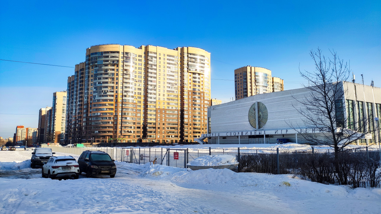 На фото запечатлены высокие жилые дома и здание спорткомплекса «Зенит», расположенные рядом в городской застройке. На переднем плане — заснеженная территория и припаркованные машины, за ограждением виден вход в спортивное сооружение. Яркое зимнее солнце подчеркивает особенности фасадов и объем планировки района. Здание спорткомплекса представляет собой пример советской спортивной архитектуры периода развитого социализма. Снимок можно использовать в публикациях о городской планировке и инфраструктуре.