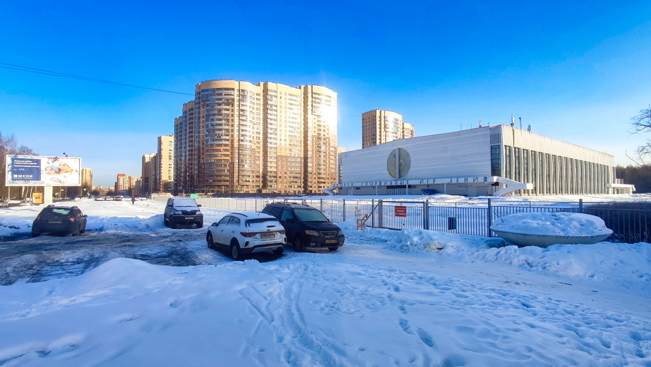 На фото показан спортивный комплекс, расположенный рядом с многоэтажными жилыми домами, покрытыми ярким солнечным светом. Перед зданием находится заснеженная территория и припаркованные автомобили. Архитектура объекта выполнена в стиле типичных советских спортивных арен, характерных для второй половины XX века, что придает снимку контекст городской спортивной инфраструктуры. Изображение можно использовать в материалах о городской среде, спорте и планировке районов.
