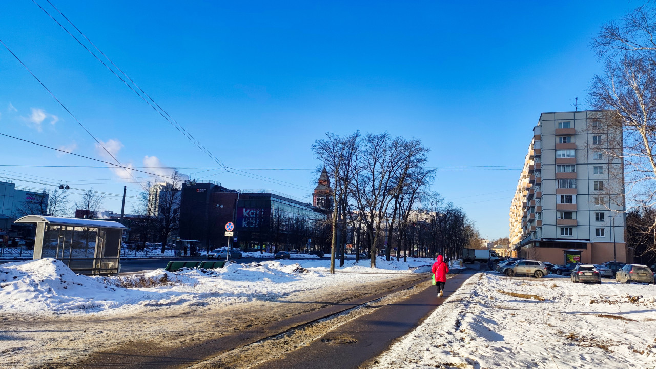 На изображении видна городская улица зимой, по тротуару идет пешеход в яркой одежде. Вдоль проезжей части расположена остановка общественного транспорта и многоэтажный дом. На заднем плане заметны здания торгового назначения и деревья без листвы, что указывает на холодный сезон. Улица оборудована освещением и наземными дорожками. Фотография иллюстрирует повседневную городскую инфраструктуру и сезонные условия в российских городах.