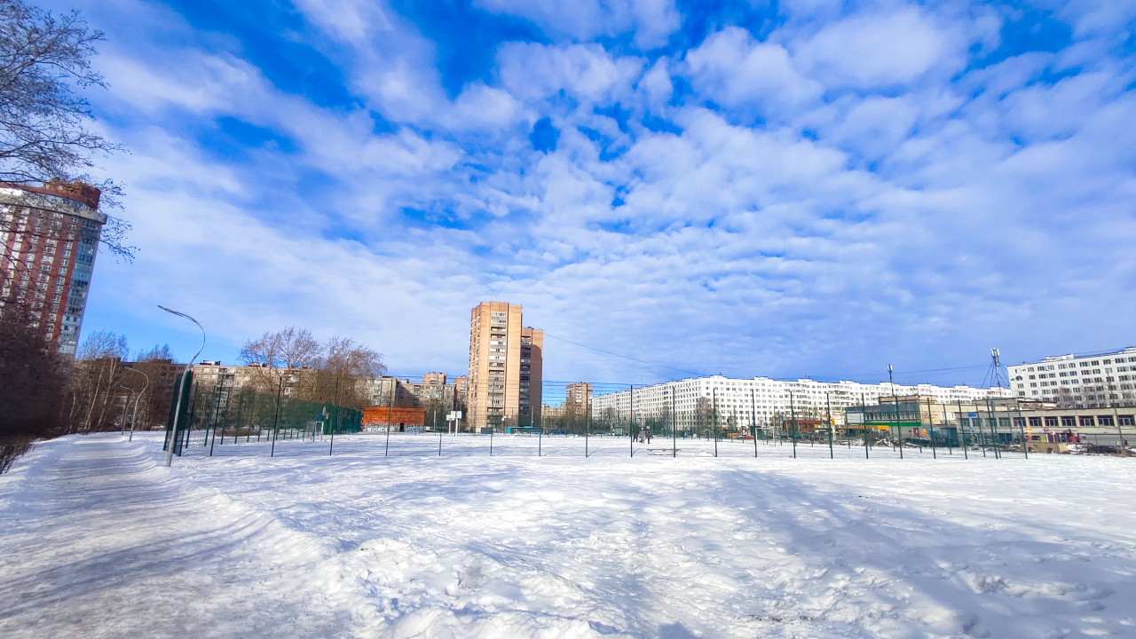 Фотография демонстрирует широкий обзор городской территории с заснеженным пустырём, окружённым многоэтажными жилыми домами. В кадре заметны как типичные панельные здания, так и более современные высотные постройки, характерные для расширения жилых районов в начале XXI века. Слева видна линия освещения вдоль пешеходной дорожки, справа — объекты школьной инфраструктуры за ограждением. Снимок может использоваться в иллюстрациях к темам городской планировки, жилищной застройки и зимнего климата в мегаполисах.