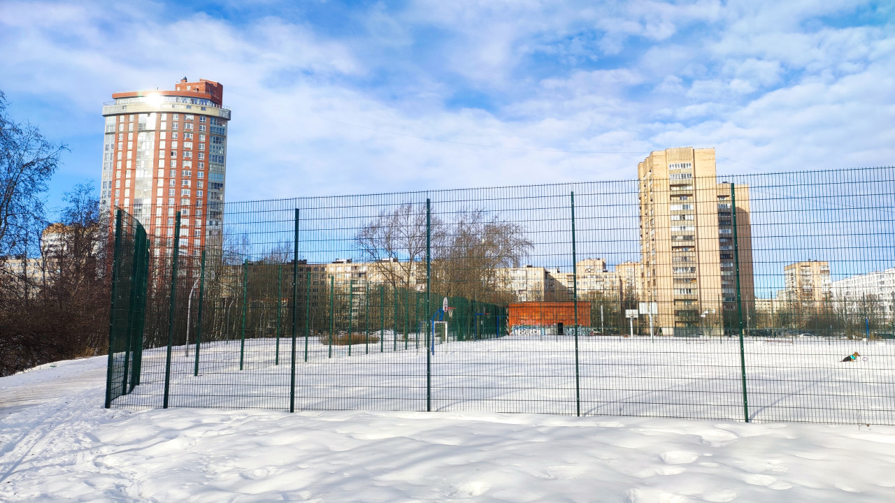 На фото представлена спортивная площадка с высоким металлическим ограждением, окружённая панельными и кирпичными многоквартирными домами. Снег полностью покрывает игровое поле, что указывает на зимний период и отсутствие использования площадки в морозную погоду. На заднем плане виден высокий жилой дом башенного типа, встречающийся в российских городах начала 2000-х годов. Кадр может быть использован для тем, связанных с городскими спортивными объектами, благоустройством и сезонным содержанием общественных пространств.