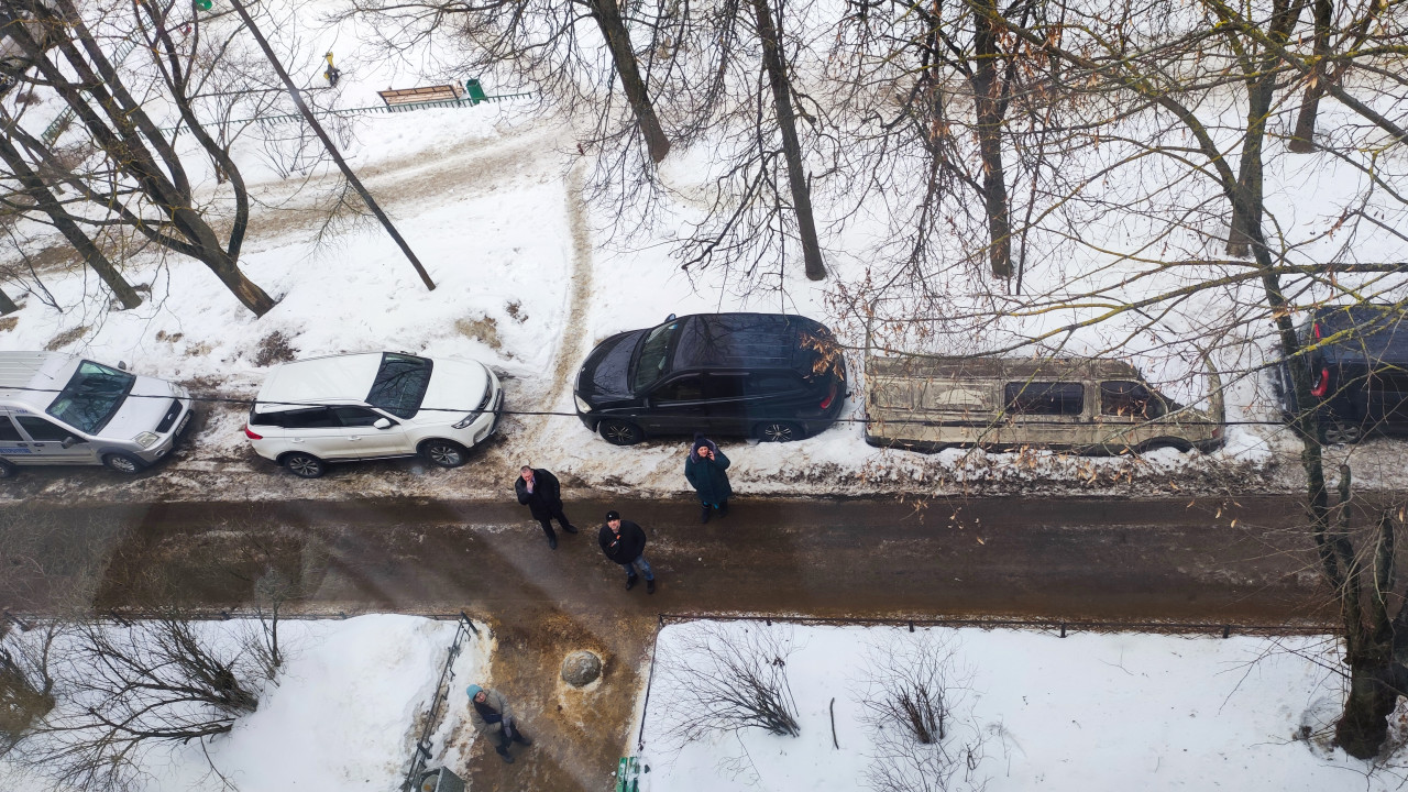 На фото сверху запечатлена городская улица зимой, заснеженные тротуары и припаркованные автомобили вдоль обочины. В центре кадра стоят несколько человек, один из которых смотрит в сторону камеры. Деревья без листвы указывают на холодный сезон. Застройка и благоустройство соответствуют типичному городскому двору в жилом районе, без объектов культурного наследия. Снимок можно использовать для иллюстраций городской среды, климата и повседневной инфраструктуры.