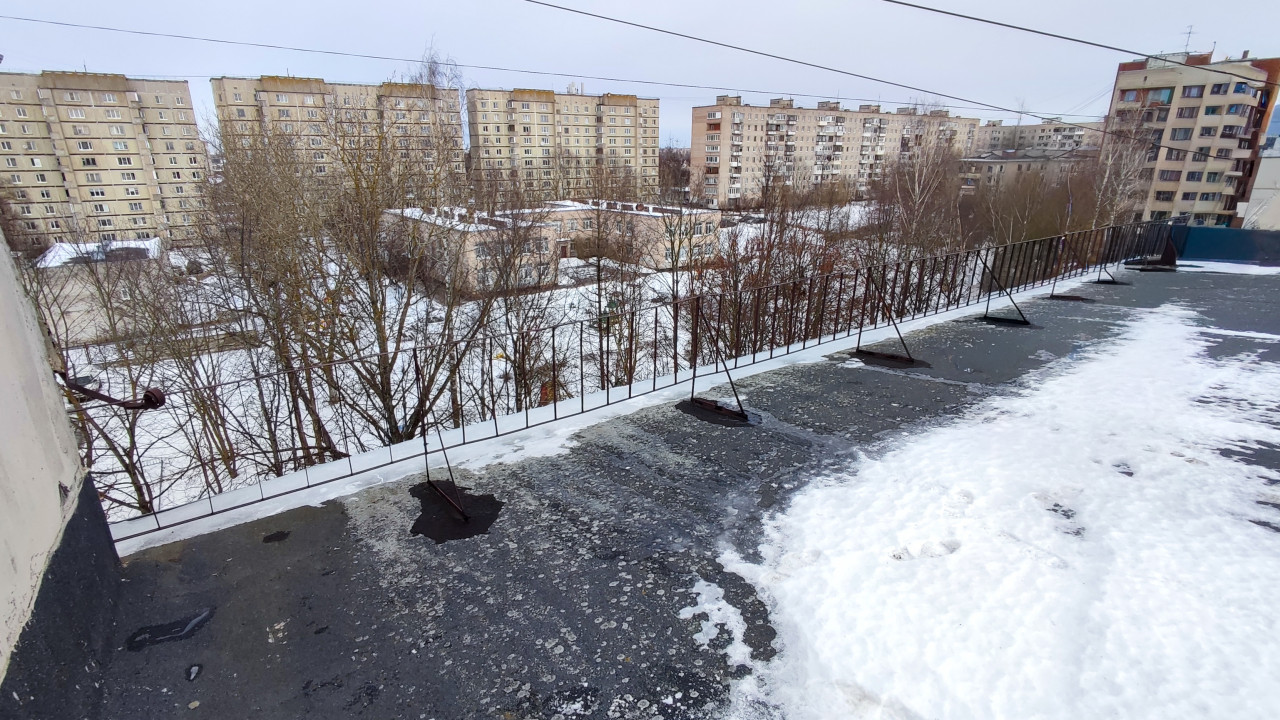 На снимке запечатлена кровля с металлическим ограждением и остатками снега, спускающимся к краю. На заднем плане видны высотные многоквартирные дома панельной серии и участок дворового озеленения с лиственными деревьями без листвы, что указывает на холодный сезон. Подобные объекты относятся к архитектуре массового жилья конца XX века. Фото может использоваться в публикациях о городском планировании, эксплуатации крыш и анализе сезонного воздействия на кровельные материалы.