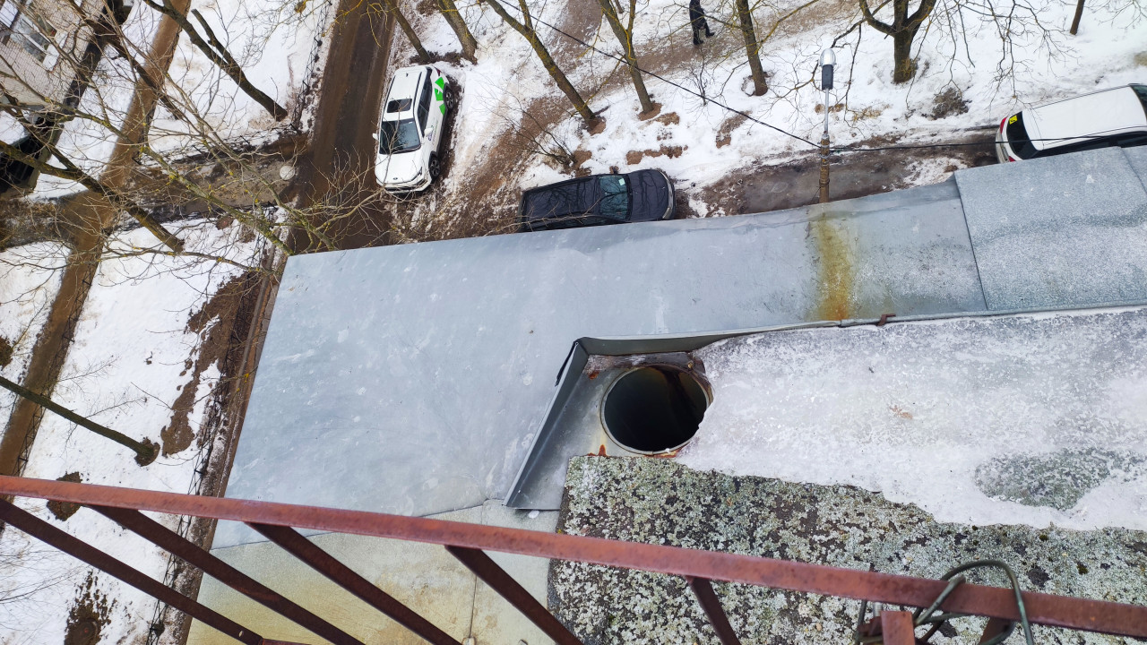 На фото показан фрагмент крыши многоквартирного дома с металлическим настилом и круглым технологическим отверстием, расположенным у края кровли. С высоты видно дворовую зону с припаркованными автомобилями, зимним покрытием и деревьями без листвы. Сцена характерна для типовой жилой застройки конца XX века, распространённой в северных и центральных регионах. Снимок может использоваться для тем о техническом состоянии крыш, сезонной эксплуатации зданий и городском благоустройстве.