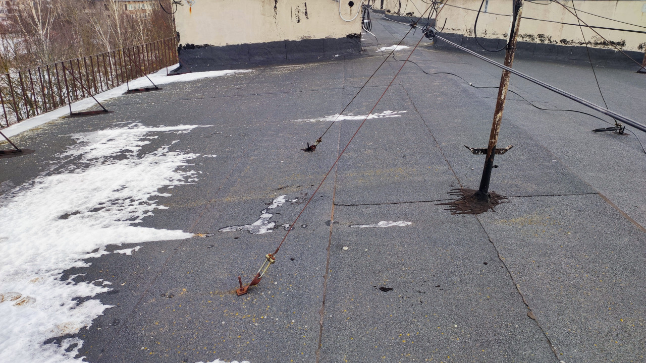 Изображение фиксирует участок плоской крыши с битумным покрытием, антенной мачтой и растяжками, закреплёнными к поверхности через металлические анкеры. Наблюдаются остатки снега и следы прежних ремонтных работ. Такие конструкции характерны для жилых домов массовой застройки второй половины XX века. Снимок применим для технической документации, статей о состоянии крыш и примеров крепления наружных коммуникаций.