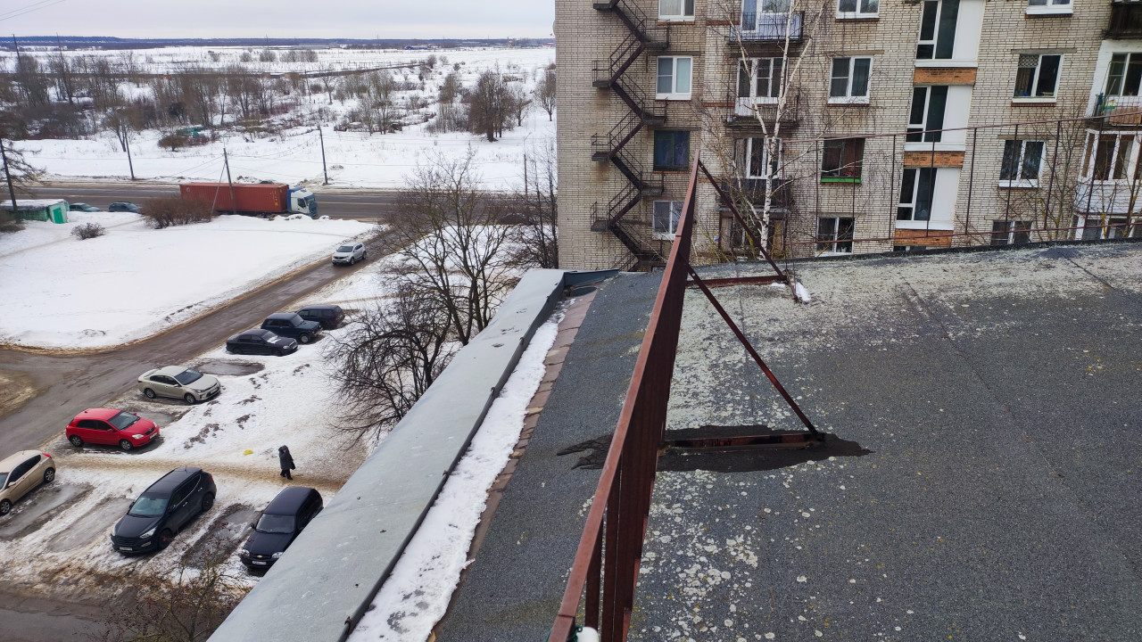 Изображение фиксирует плоскую крышу жилого здания с перильным ограждением и участок двора с припаркованными автомобилями, расположенными вдоль подъездной дороги. На фасаде соседнего дома видна внешняя пожарная лестница, характерная для многоквартирных построек советского периода. Состояние кровельного покрытия и снеговые разводы указывают на зимний сезон. Фото подходит для материалов о безопасности на крышах, планировке дворовых территорий и визуальном обследовании зданий.