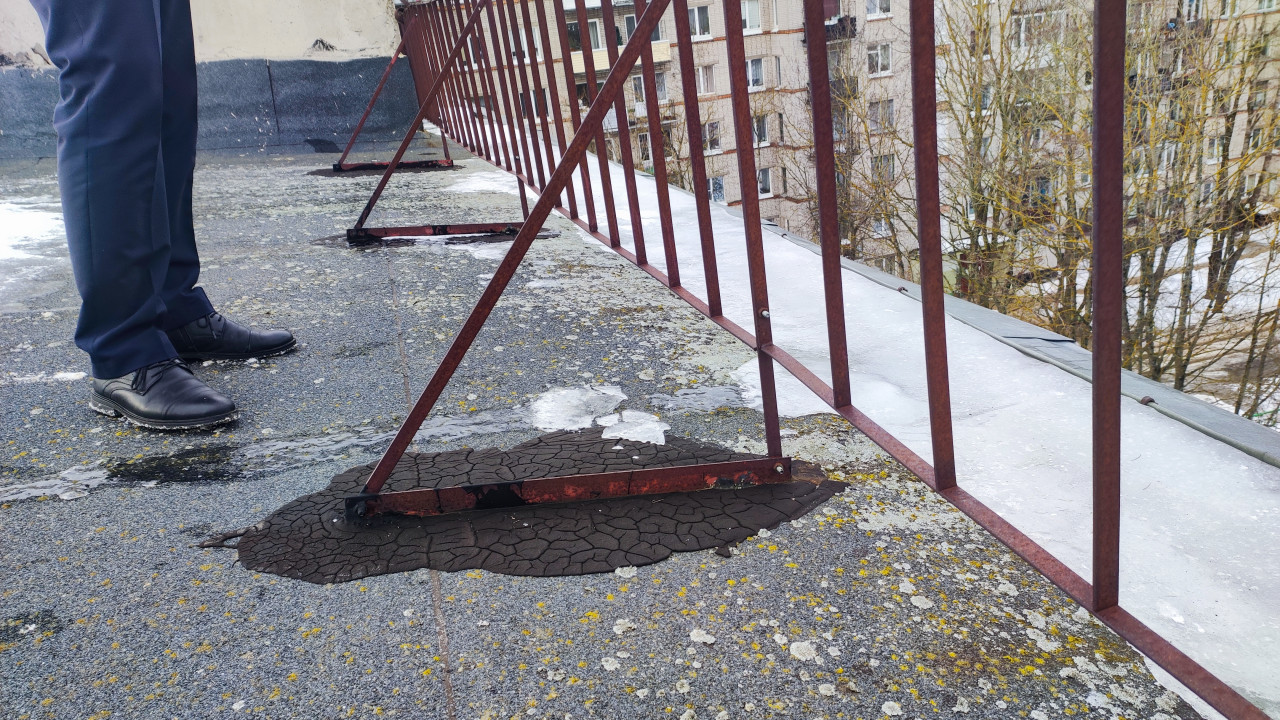 крыша кровля снег зима многоквартирный дом старый фонд советская застройка крепление ограждение стойка монтаж обследование безопасность трещины битум гидроизоляция инженерная диагностика осмотр эксплуатация сезонность ремонт технадзор городская застройка металлоконструкция высота крепёж перила инженерные системы эксплуатационный контрольПохожие фотографии