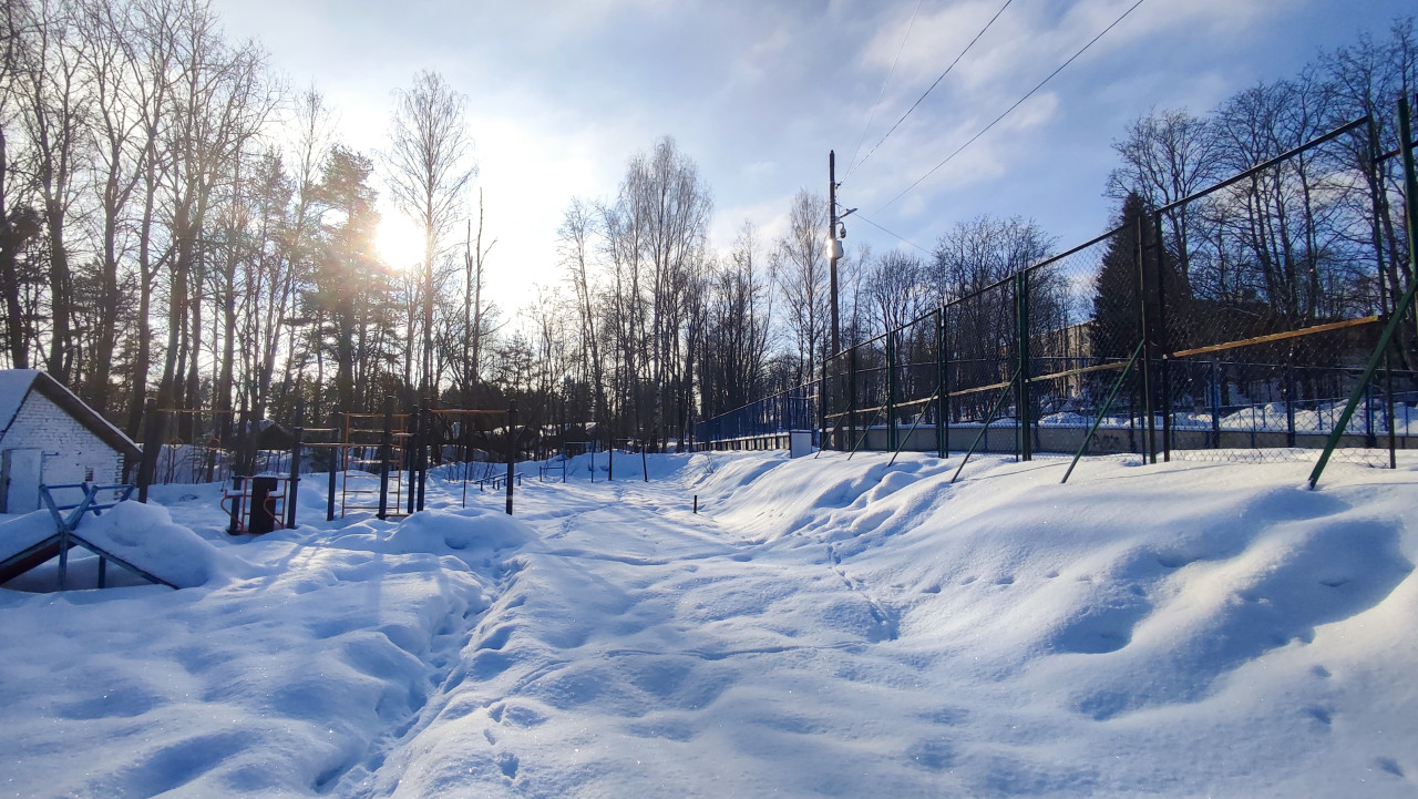 На фото изображена открытая спортивная или дворовая площадка, покрытая глубоким снегом, рядом с лесополосой и высоким металлическим ограждением. За оградой видны высокие деревья без листвы, а на горизонте просматривается низкое зимнее солнце. По краю территории проходит линия электропередачи и деревянные опоры освещения. Такое пространство характерно для пригородных или парковых зон. Снимок подходит для тематики зимнего отдыха, сезонных условий, благоустройства и территорий рядом с жилыми массивами.