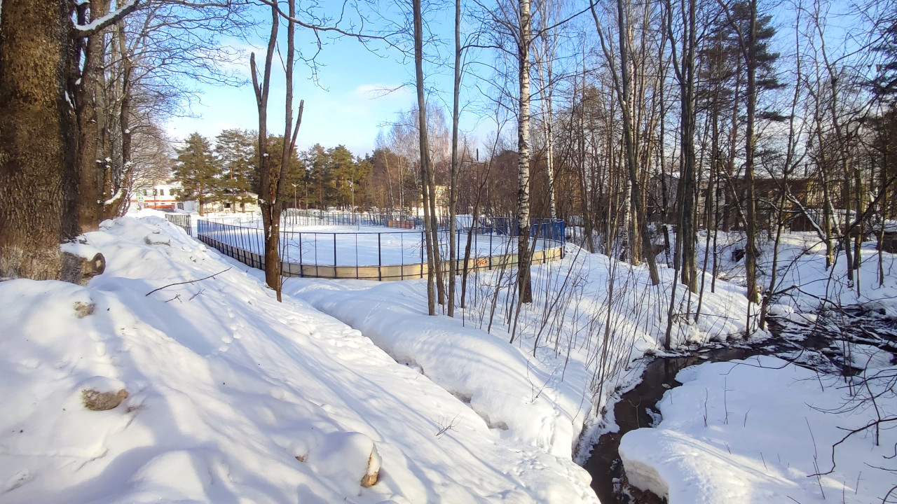 На фото изображена лесная зона с огражденной спортивной площадкой, напоминающей хоккейную коробку, расположенной у подножия снежного склона. Справа проходит открытый ручей, частично покрытый снегом, что придает территории природный характер. На заднем плане видны здания, окруженные деревьями, указывающие на близость жилого массива. Пространство демонстрирует сочетание городской инфраструктуры и природного окружения. Снимок может использоваться в темах экологии, благоустройства и зимнего ландшафта.