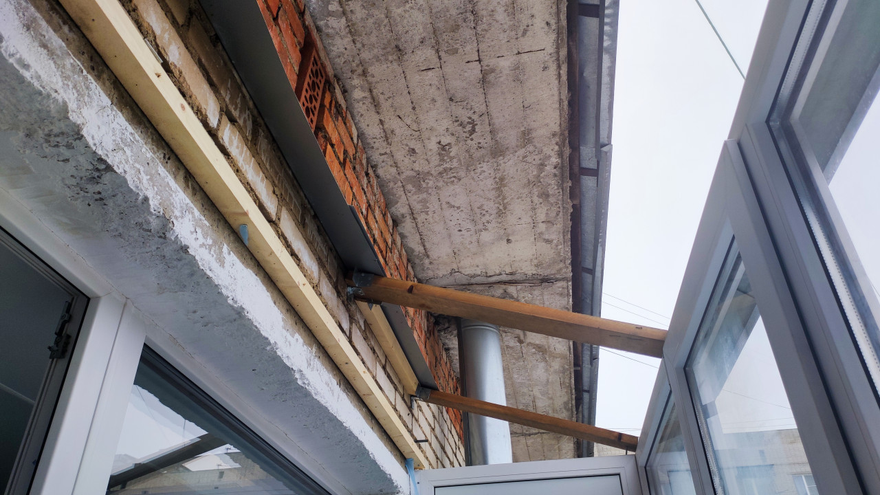 Фотография фиксирует участок балконного узла, где к кирпичной стене крепятся деревянные балки под будущую кровлю; сверху видна старая бетонная плита перекрытия, сохранившая следы эксплуатации. Слева заметна часть пластиковых оконных рам, указывающая на недавнее остекление лоджии. Аналогичные архитектурные решения применялись в городских жилых домах конца XX века, когда наружные балконы увеличивали полезную площадь квартиры. Снимок подходит для статей и инструкций по монтажу навесов и реконструкции фасадов.