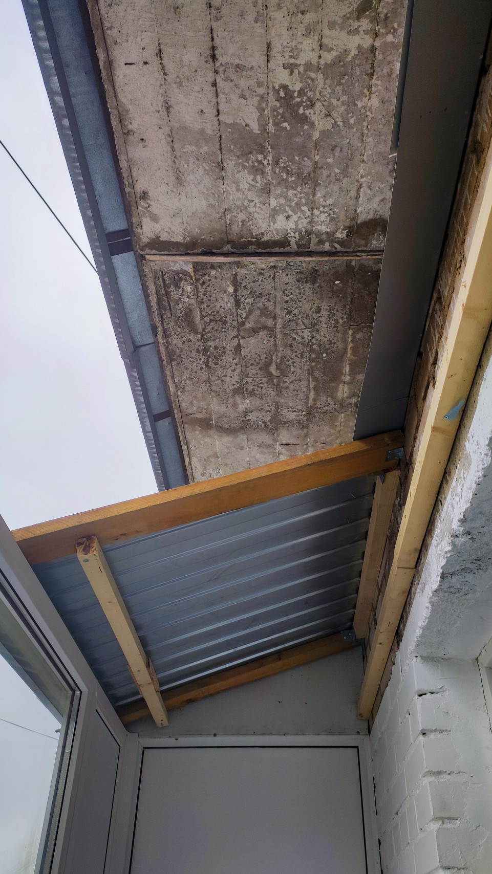 На изображении показана балконная зона под бетонной плитой перекрытия с частично установленной кровлей и видимыми деревянными стропилами. В нижней части виднеется профнастил, образующий новый навес, а рядом располагаются пластиковые оконные конструкции, указывающие на недавнее остекление. Подобные элементы характерны для жилых домов массовой застройки, где балконы используются как вспомогательное помещение. Снимок подходит для иллюстраций проектов реконструкции лоджий и технических решений.