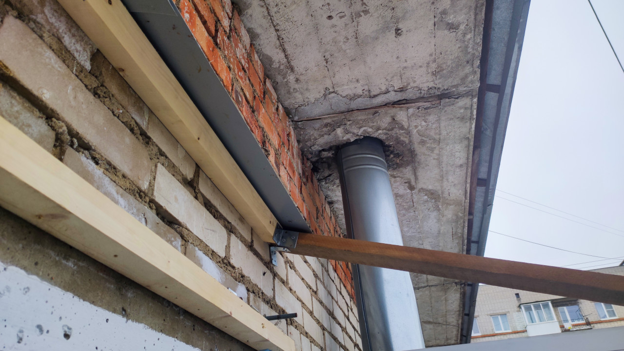 Кирпичная стена и вентиляционная труба под перекрытием балкона
