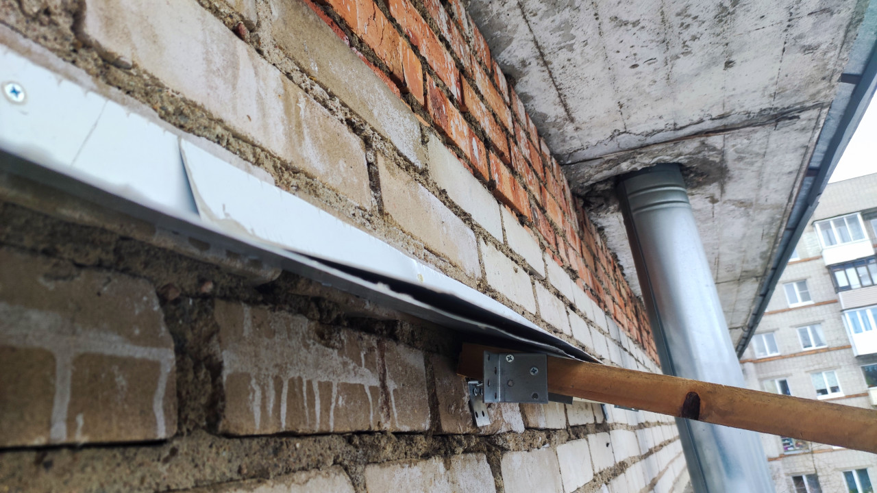 Снимок показывает нижний участок монтажной зоны балконной крыши, где металлический профиль примыкает к кирпичной стене под бетонной плитой. На фото различимы металлические крепежные элементы, вентиляционная труба и следы старого раствора. Конструкция характерна для городских домов массовой застройки и может быть использована в учебных и технических публикациях о ремонте и утеплении лоджий.