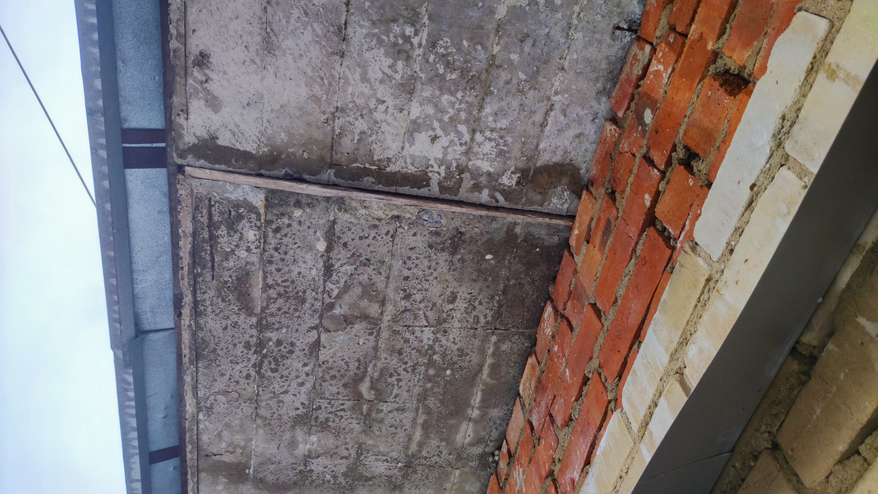 На изображении зафиксирован монтажный стык плиты перекрытия и кирпичной кладки, где видна линия сопряжения и старый деревянный вкладыш, применявшийся при опалубке. Подобные узлы характерны для домостроения 1970–1980 годов, выполненного в смешанной технологии с применением сборных плит и кирпичных наружных стен. Снимок может быть использован в проектах по оценке состояния несущих стыков, учебных материалах о конструкционной диагностике и примерах типовых фасадных швов.