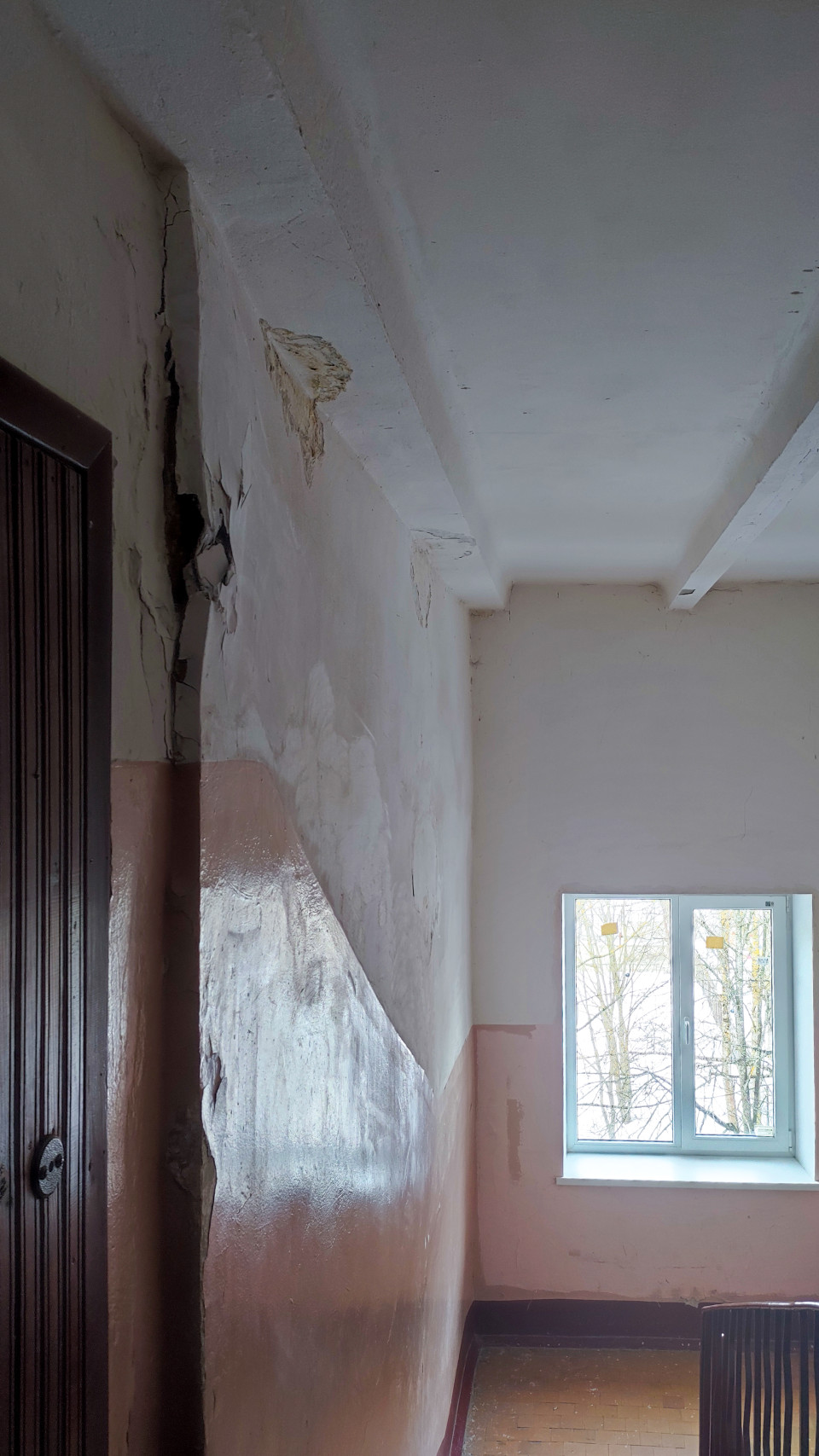 Снимок передает участок стены и потолка в подъезде многоквартирного дома, где заметны глубокие трещины, отслоение штукатурки и потеки от влаги. В кадре присутствует окно с зимним пейзажем за ним, а также характерная двухцветная окраска стен, типичная для подъездов жилых зданий советского периода. Фотография может быть использована для материалов о техническом состоянии жилфонда, последствиях протечек и необходимости капитального ремонта.