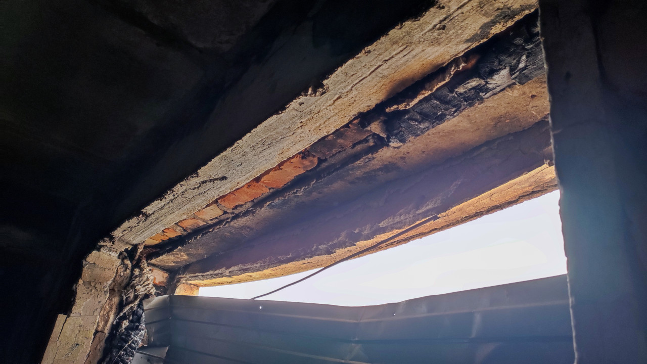 На фото показан разрушенный оконный проём в заброшенном здании, через который частично видно дневное освещение. Перекрытие выполнено из бетона и кирпича, местами присутствуют следы копоти и выгорания, что указывает на воздействие высоких температур в прошлом. Нижняя часть отверстия закрыта листовым материалом, используемым как временная защита. Снимок отражает процесс физического износа жилого фонда, характерного для построек середины–второй половины XX века. Фото может применяться в материалах о техобследованиях, архитектурных дефектах и визуальной фиксации состояния конструкций.