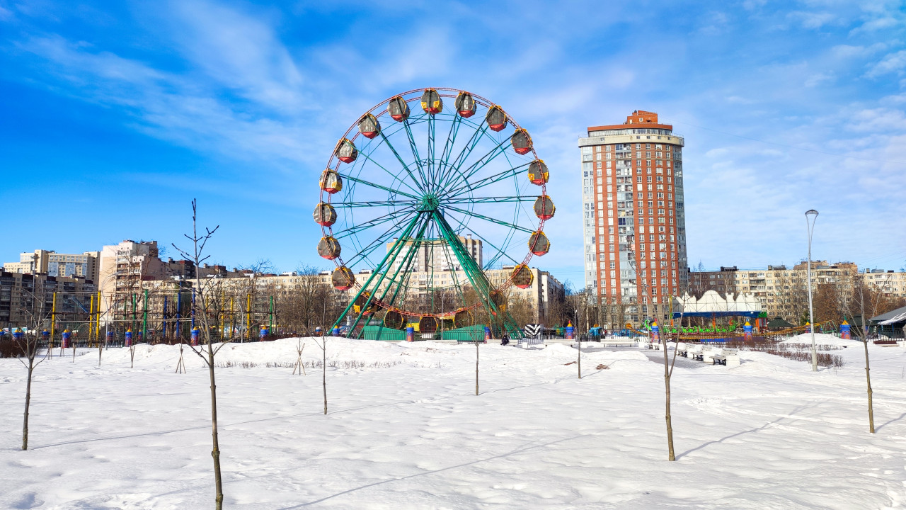 На снимке изображено колесо обозрения на закрытой территории парка аттракционов, окружённого заснеженной площадью и жилыми домами. Справа видна высокое жилое здание башенного типа, характерное для современной городской застройки. Деревья и ограждение указывают на территорию рекреационной зоны, а само колесо выступает как сезонный аттракцион. Снимок может использоваться в материалах о городской инфраструктуре отдыха и спортивно-развлекательных пространствах.